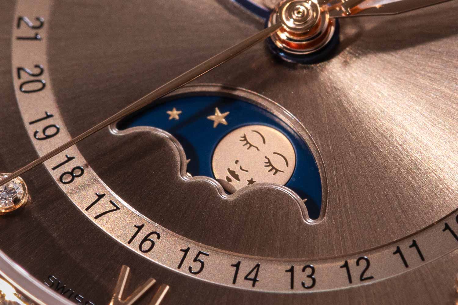 The same formula extends to the smaller 33 mm Phase de Lune designed for women (there’s also a men’s version with a complete calendar and moon phase at 40 mm). It carries the same large applied logo at 12 o’clock and the luminous hands. Yet the watch stays classical where it matters. The blued steel serpentine hand for the date is wonderfully traditional and gives the watch real character, setting it apart from most moon phase models on the market, regardless of whether they’re made for men or women. And naturally, the moon phase disc comes with a distinctive expressive face in 18k red gold, set against a dark blue ceramic base.
