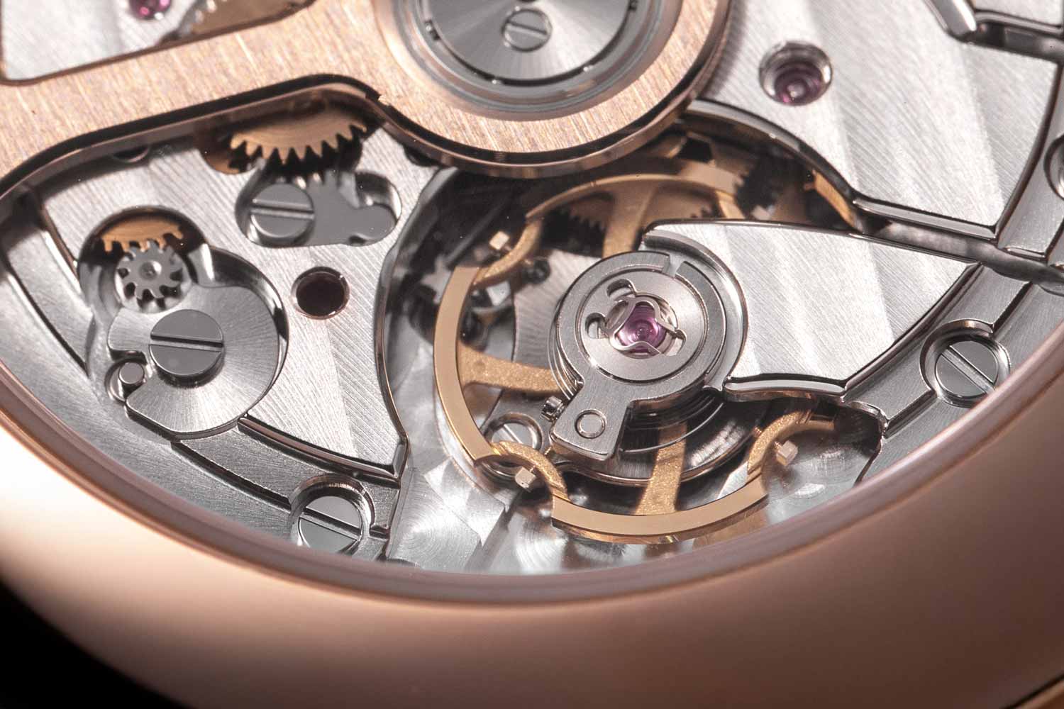 The rounded bevels are a telltale sign of hand finishing. In this case, they likely begin as machine-cut angles that are then polished by hand-held tools, rather than being shaped entirely by hand from the start. Still, the resulting curve and shine carry the warmth and effort of the finishers’ craft, giving the movement an unmistakable human touch.