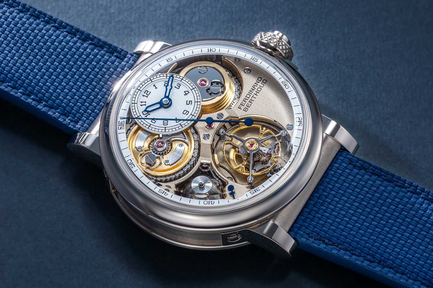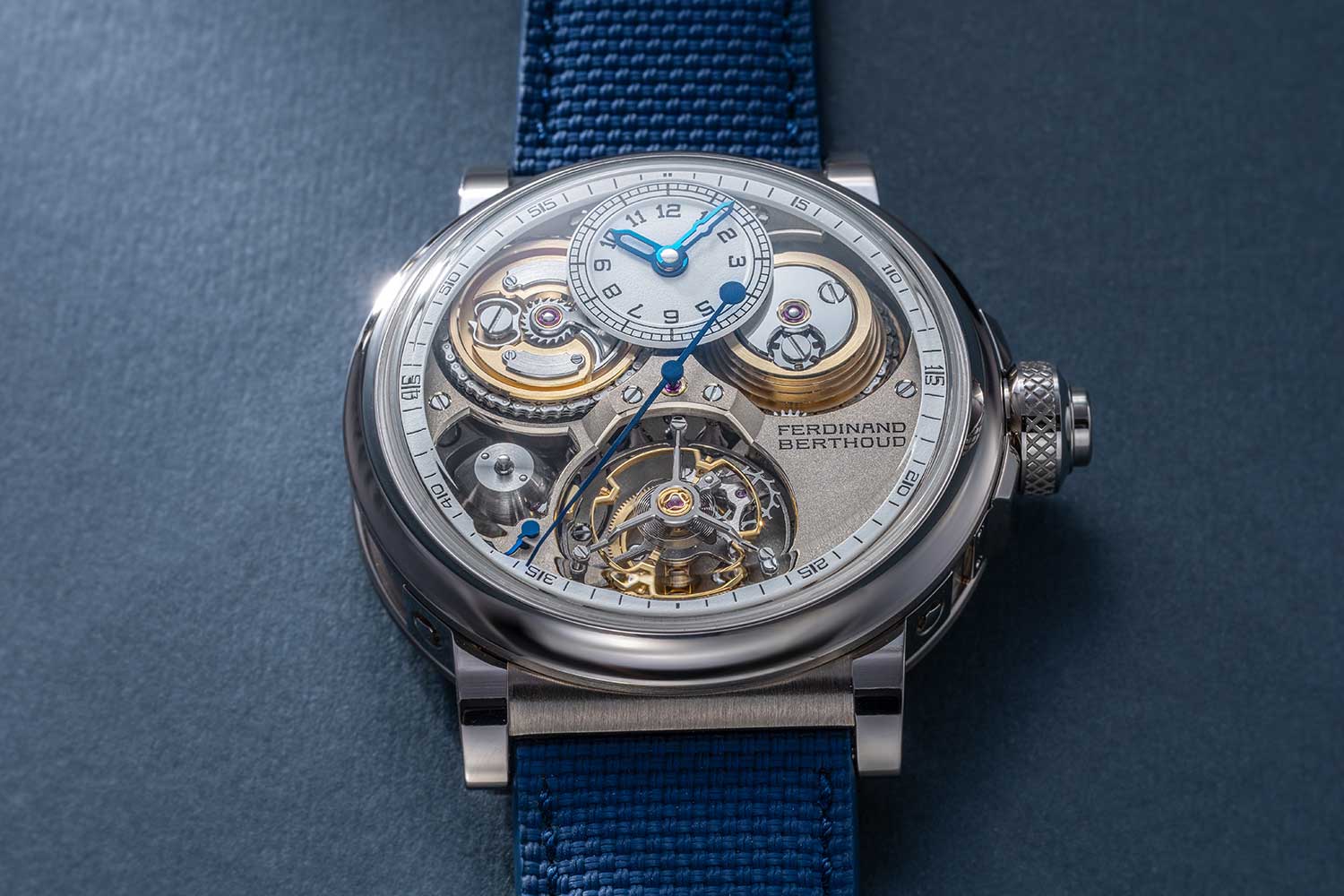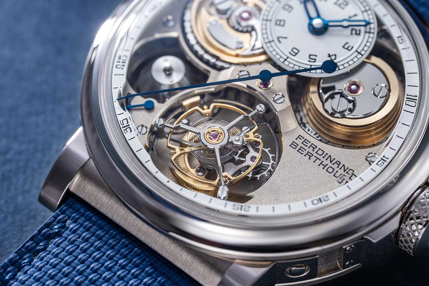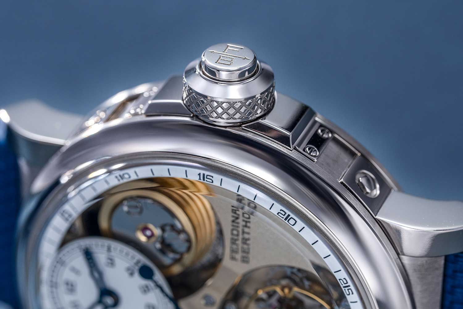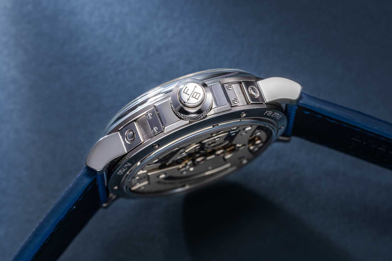 The FB 2TV is part of the FB 2 series and, unlike the FB 1 with its octagonal case, adopts a round profile that recalls the protective brass drums used in marine chronometers. Made in ethically sourced white gold, it has a robust, substantial construction with short tapered lugs that are secured to the case by bolts. The crown is large in diameter and deeply knurled while the crown guard is secured to the case middle by screws. As before, the crown incorporates a safety device that disengages the crown from the winding pinion once the barrel is fully wound.