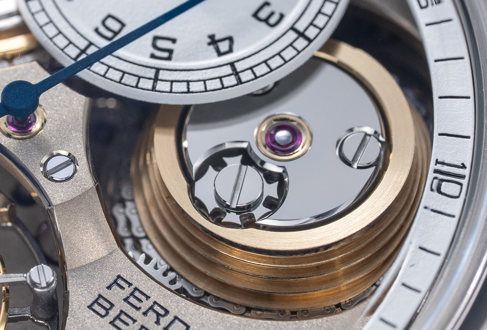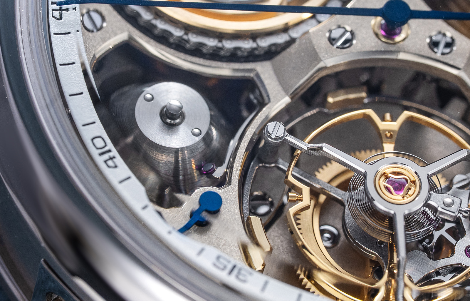 The flying barrel of Calibre FB-T V.FC has also been reworked. Unlike the first calibre, the barrel drum no longer has the circumferential grooves that previously guided the chain, and this reduces friction as the chain travels across the surface.