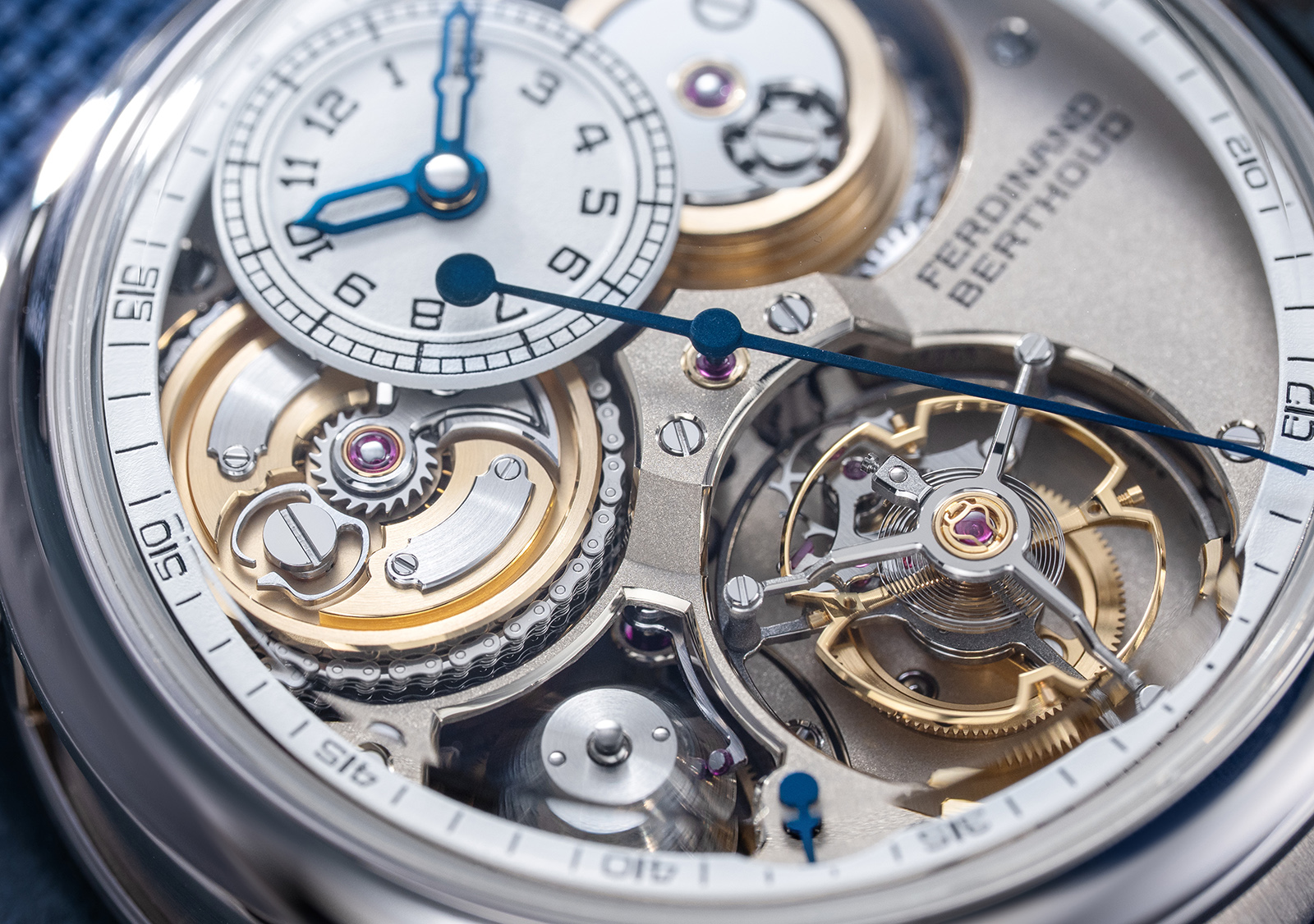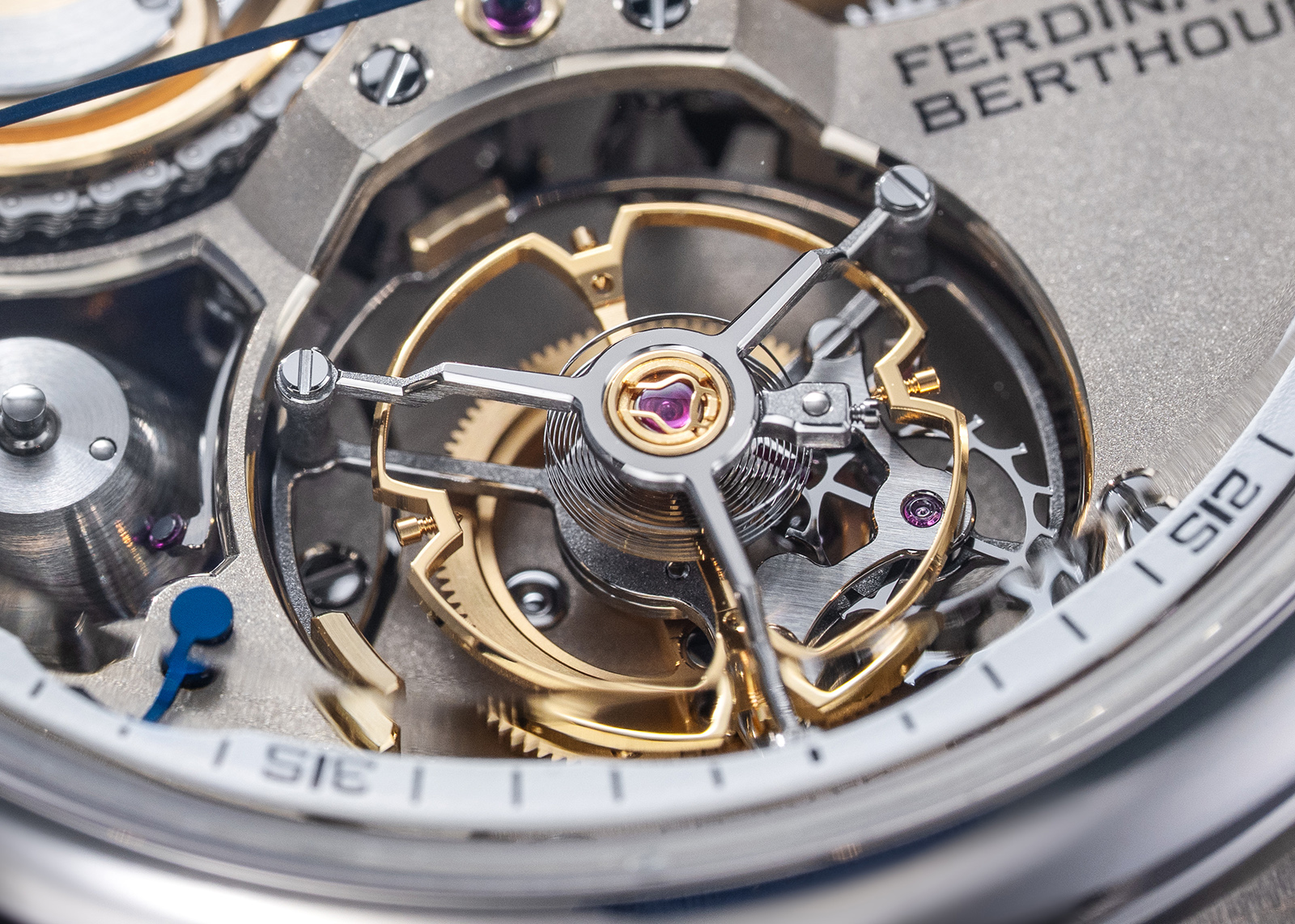 The new Calibre FB-T V.FC was thoroughly redesigned while retaining the defining characteristics of the first calibre – chain-and-fusée, tourbillon and the cone-and-feeler power reserve device. Notably, it introduces both a hacking seconds and a zero-reset mechanism.