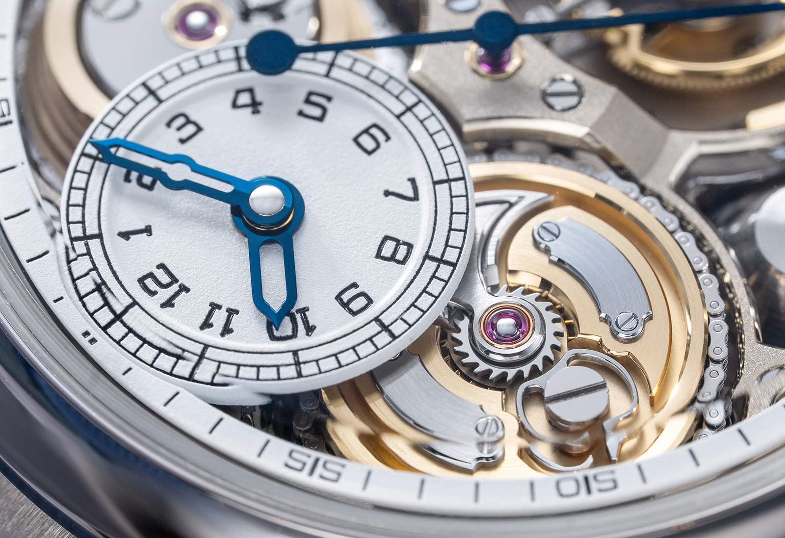 With all the principal components brought to the dial side, the reverse is left to accommodate the gear train. The zero-reset mechanism is fully exposed, which turns the back of the watch into a stage of its own.