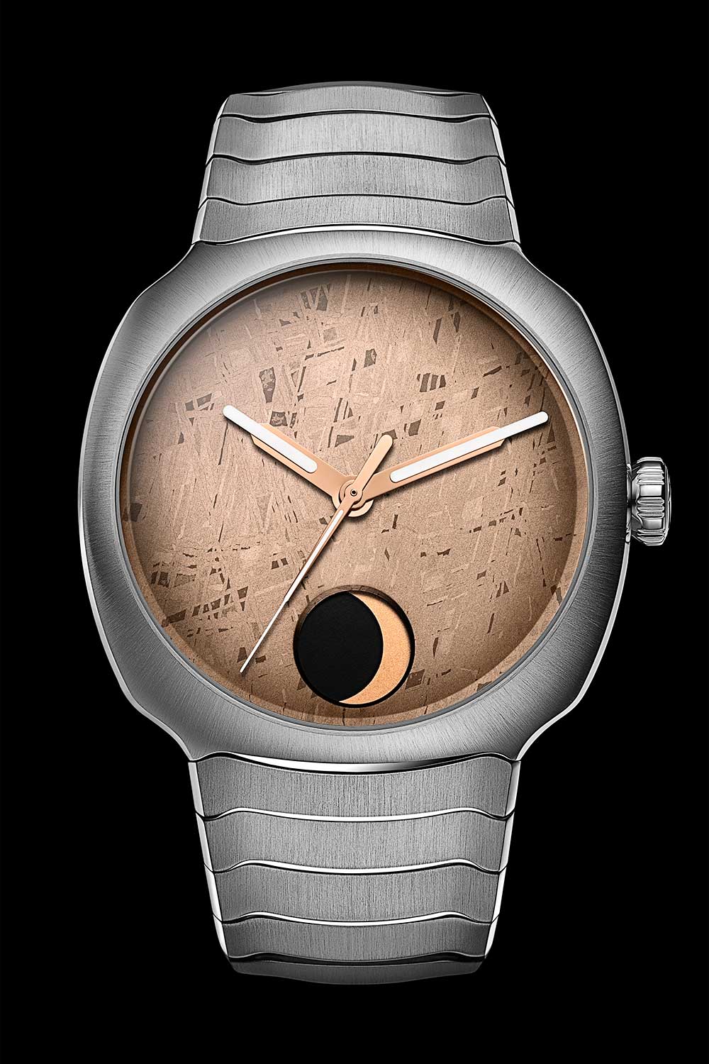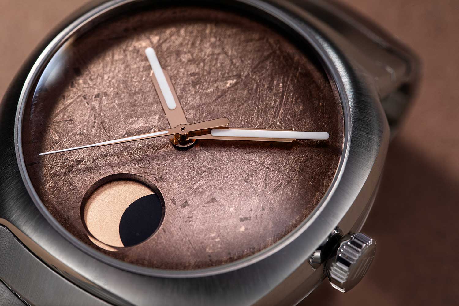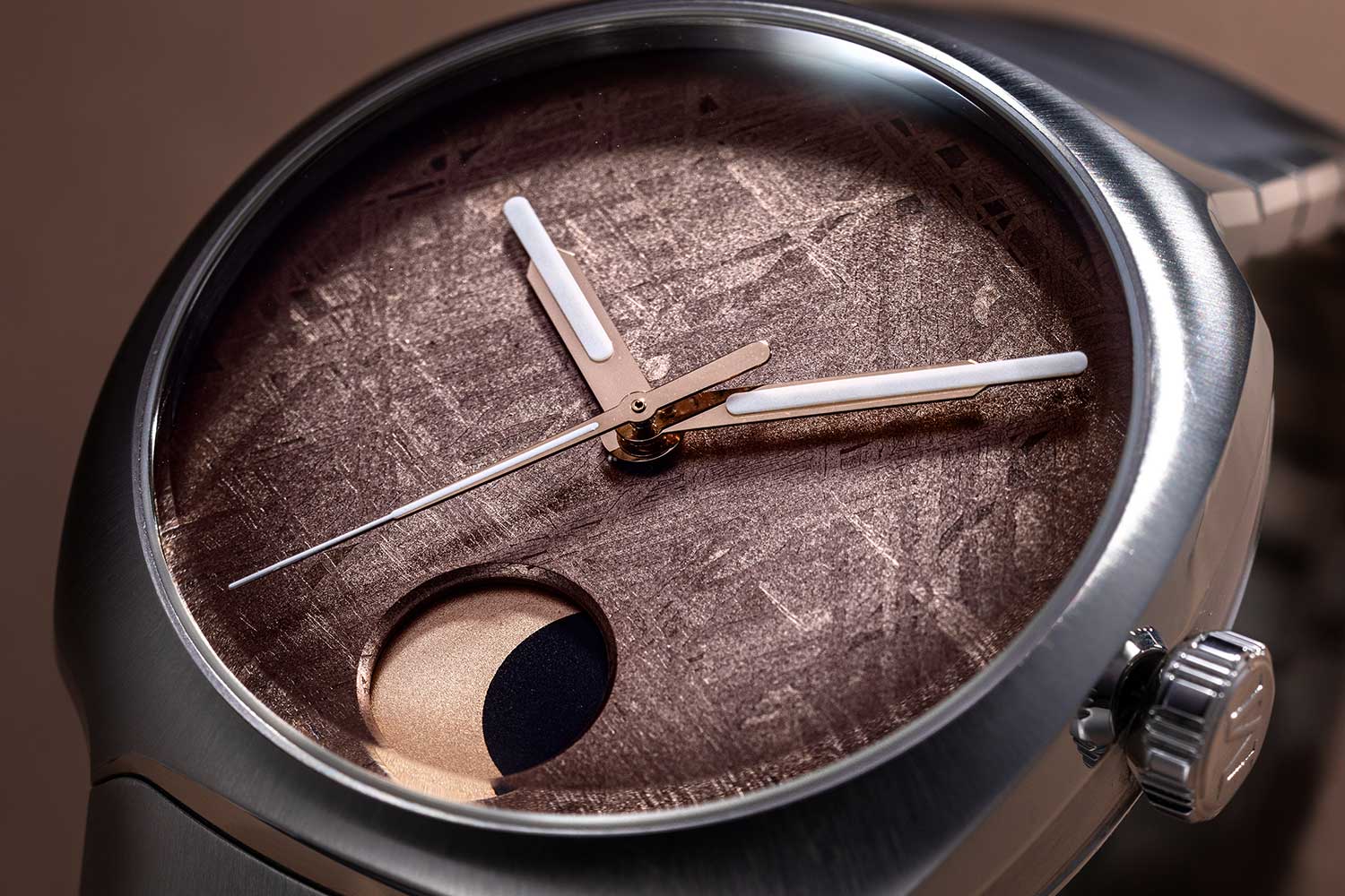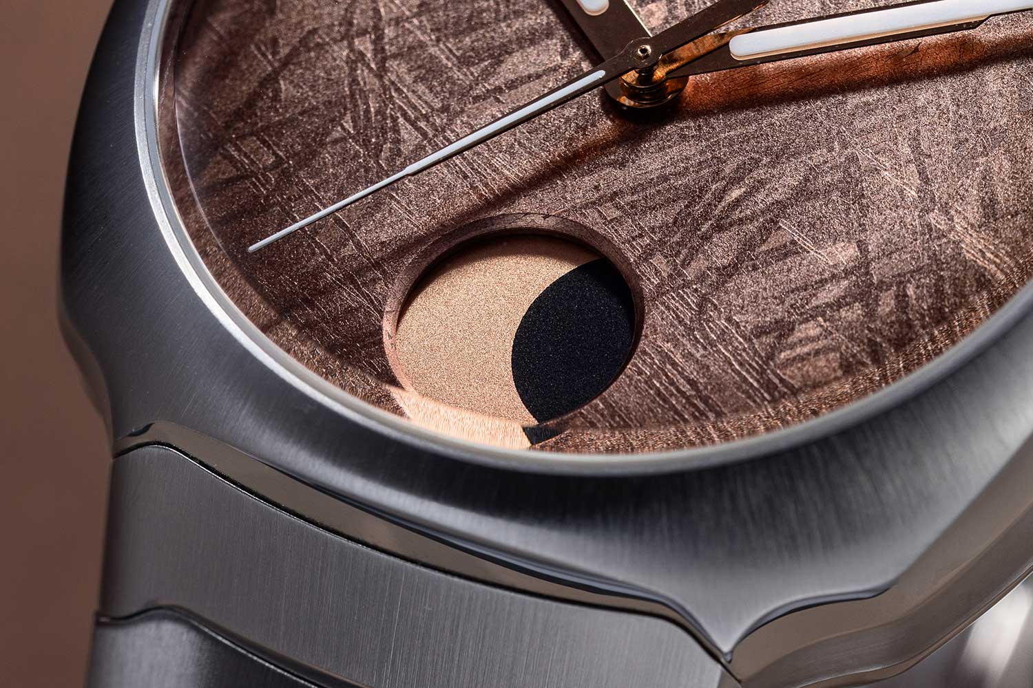 Combining an integrated sports watch design with a moonphase complication is a difficult thing to do convincingly, as the two emerge from fundamentally different watchmaking traditions and priorities. A moonphase belongs to the classical language of dress watches, where it serves a poetic and astronomical role rather than a practical one, while sports watches are shaped by demands of daily wear and practical use. The reason it works remarkably well here is because the moonphase is executed as a graphic element rather than a romantic one. Just as importantly, the meteorite dial is rendered in an unusually warm, muted tone that softens the sports-oriented character of the watch.