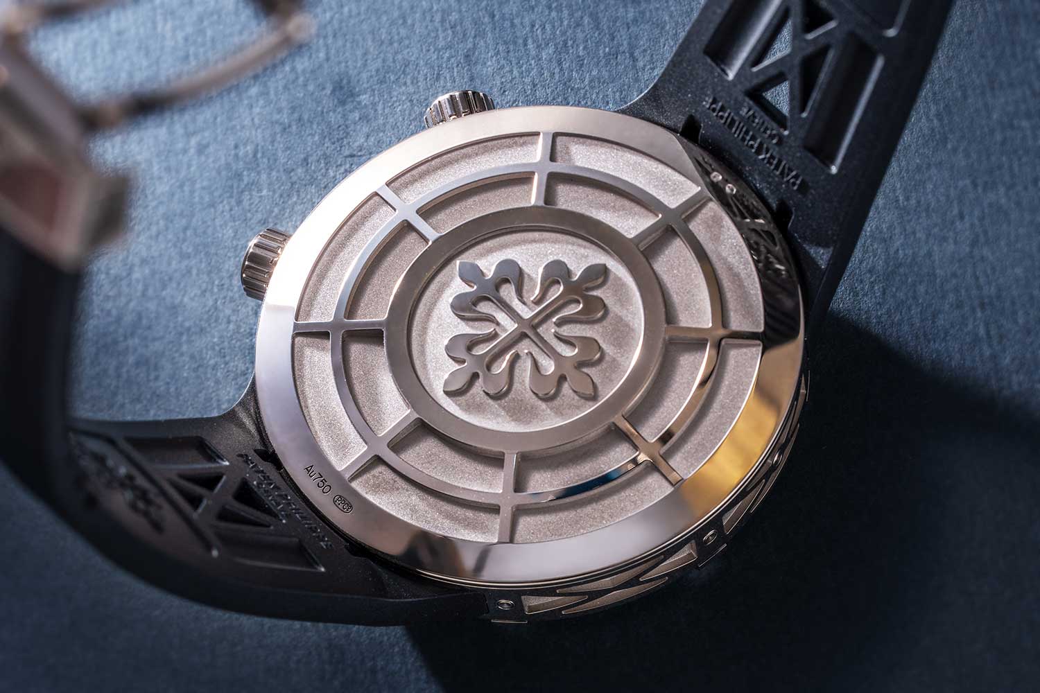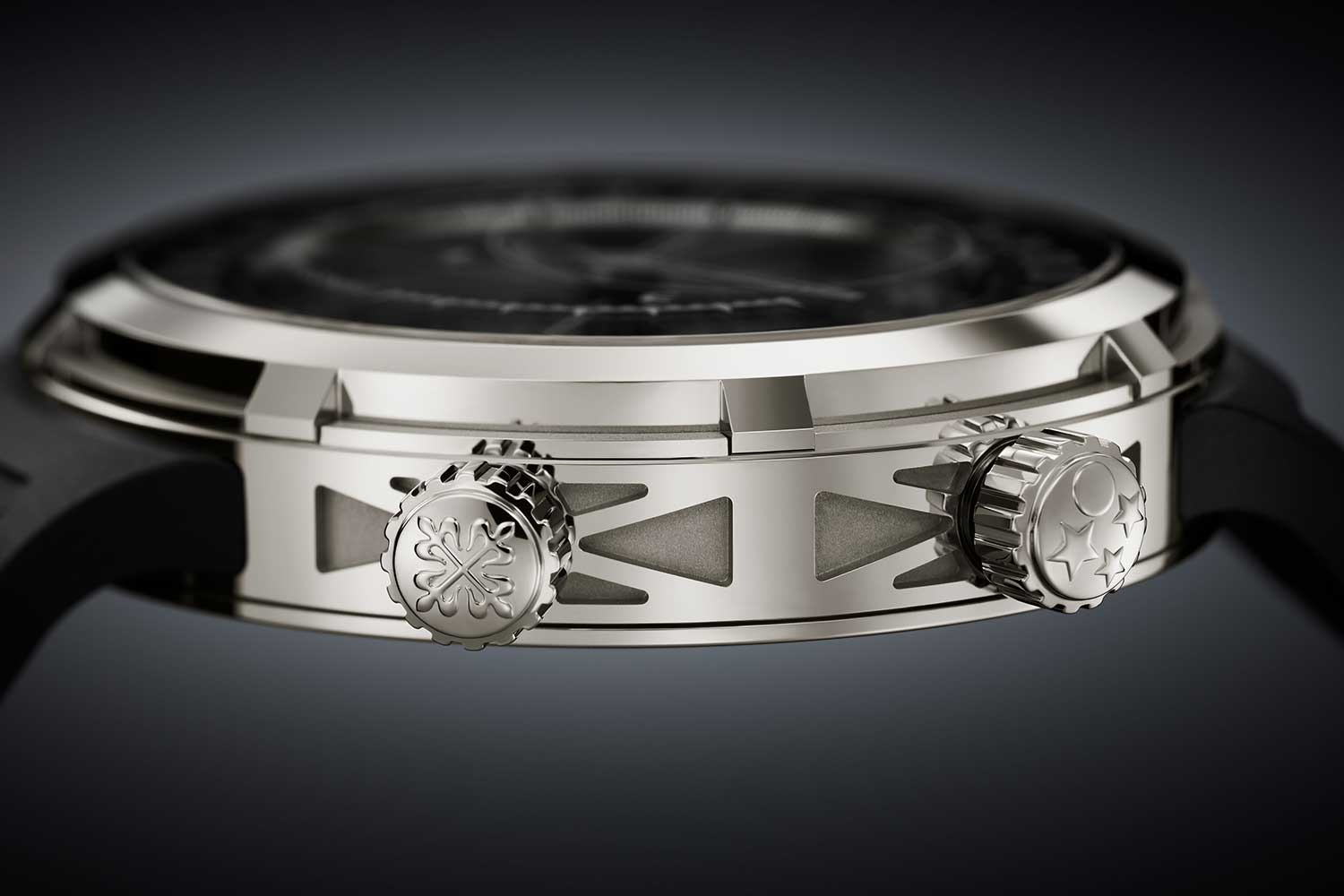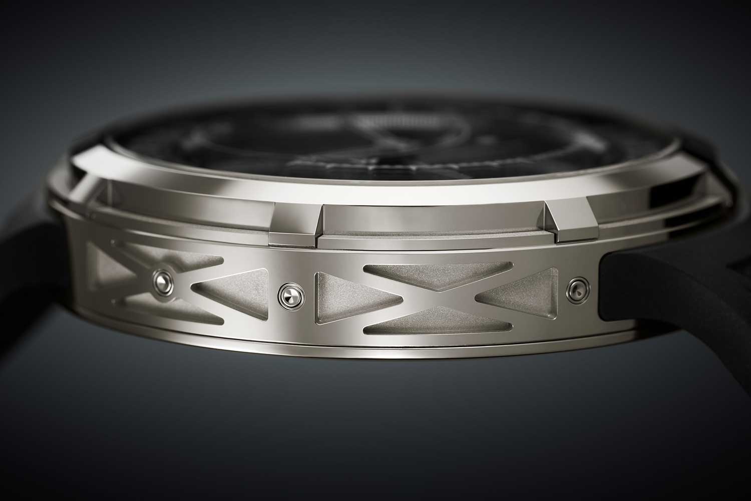 The case, though unconventional, is rather attractive. It was conceived to echo the astronomical theme of the watch, with a streamlined, lugless form that lends it a distinctly forward-looking character. The caseband is articulated with an X-shaped motif in relief, recalling the cross-braced tubular frameworks of space modules. This pattern continues onto the solid caseback, where it converges around a Calatrava Cross.