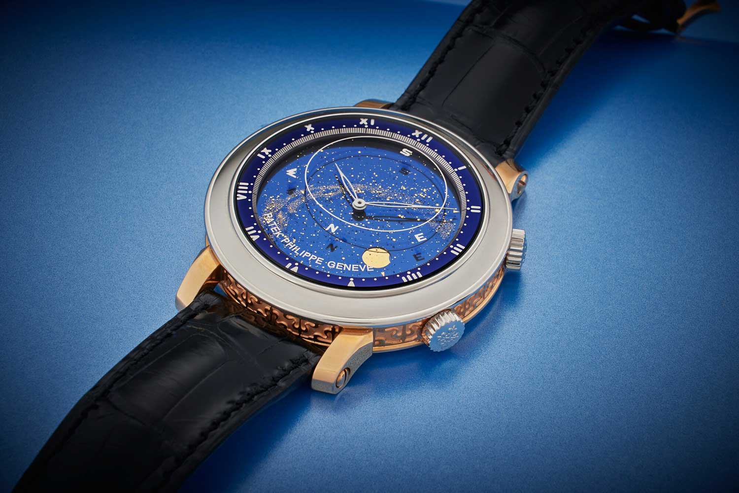The particular combination of a celestial star chart with moonphase and indications for sunrise and sunset is not new to Patek Philippe. It appears in two of the most famous complicated watches made for James Ward Packard and Henry Graves Jr. in the early 20th century, and persisted through later works such as the Calibre 89 and the Star Caliber 2000.