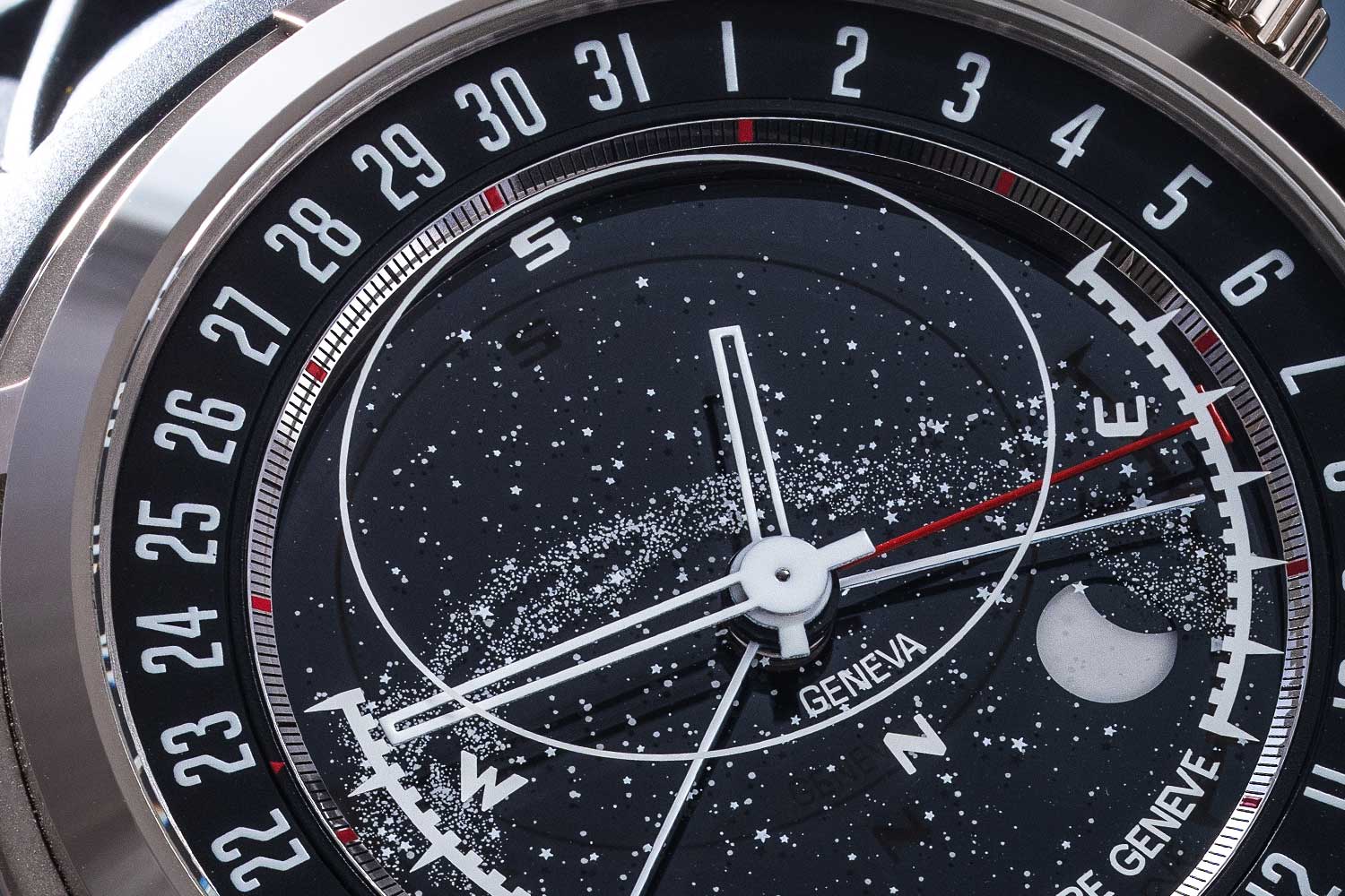 Dial Sapphire and mineral crystal discs with metallization; sky chart calibrated for Geneva latitude with elliptical horizon, cardinal points and “GENEVA”; peripheral date scale; sunrise and sunset scale