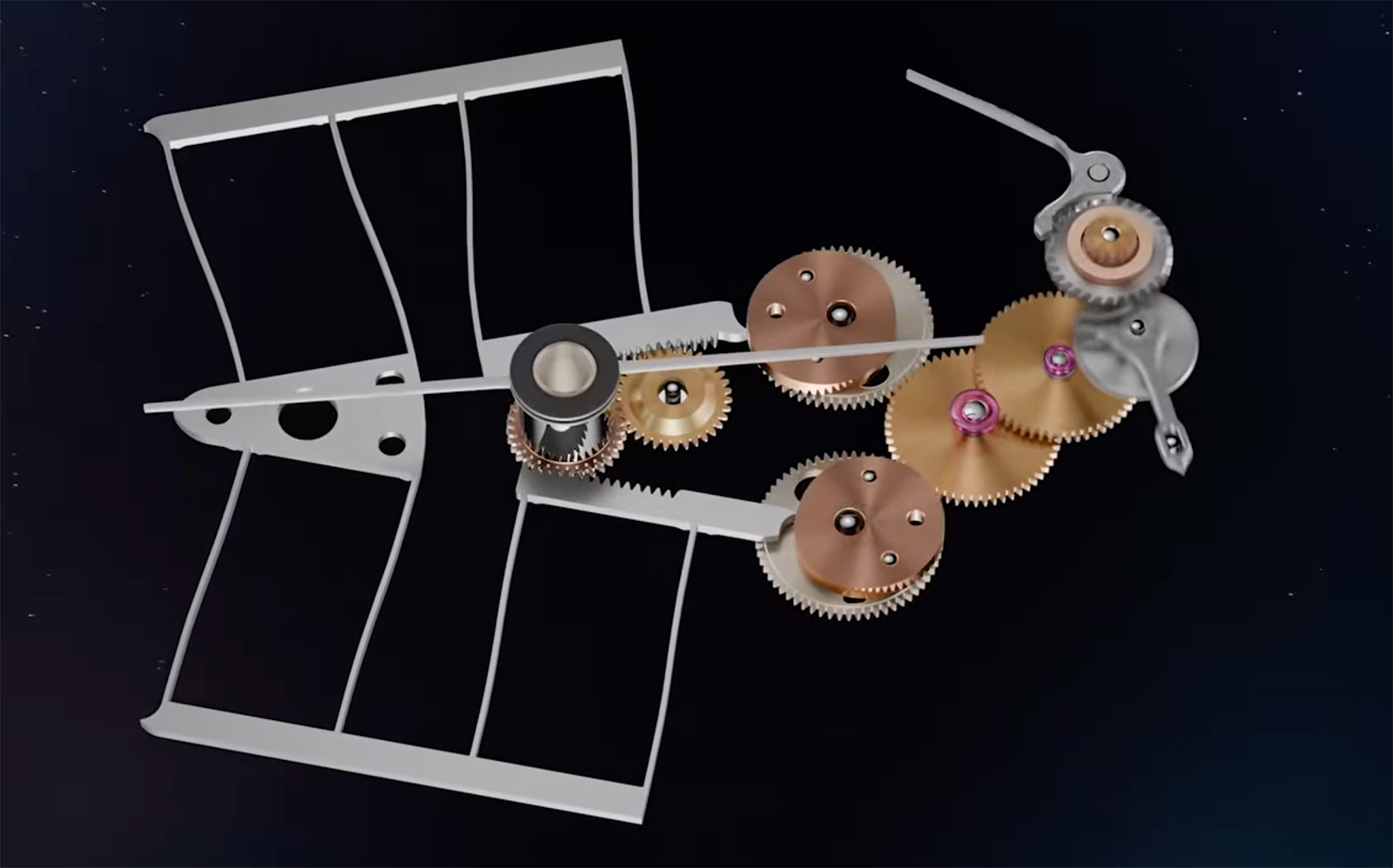 Patek’s solution removes this entire layer of complication by ensuring that the feeler does not pivot at all. Each cam is still driven by a wheel that completes one rotation per year, so the underlying astronomical encoding remains the same. But instead of a rack mounted on a pivot, the cams are read by longitudinal feelers whose motion is constrained to a straight line. This is achieved by a system of flexible strips arranged in parallel, forming a double flexure that both presses the feelers against the cams and guides their motion.