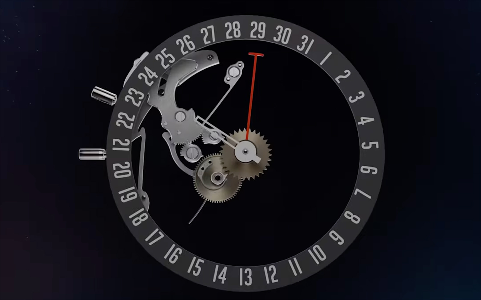 Beneath it sits a black PVD-treated disc made of mineral crystal, carrying a cut-out representing the Moon. This lunar disc is mounted on the same central axis and driven independently, again via a friction-coupled transmission, at a rate of every 24 hours, 50 minutes and 28.328 seconds per rotation. This slightly slower rotation reflects the Moon’s eastward motion in its orbit, so that its apparent position against the celestial vault shifts progressively from day to day.