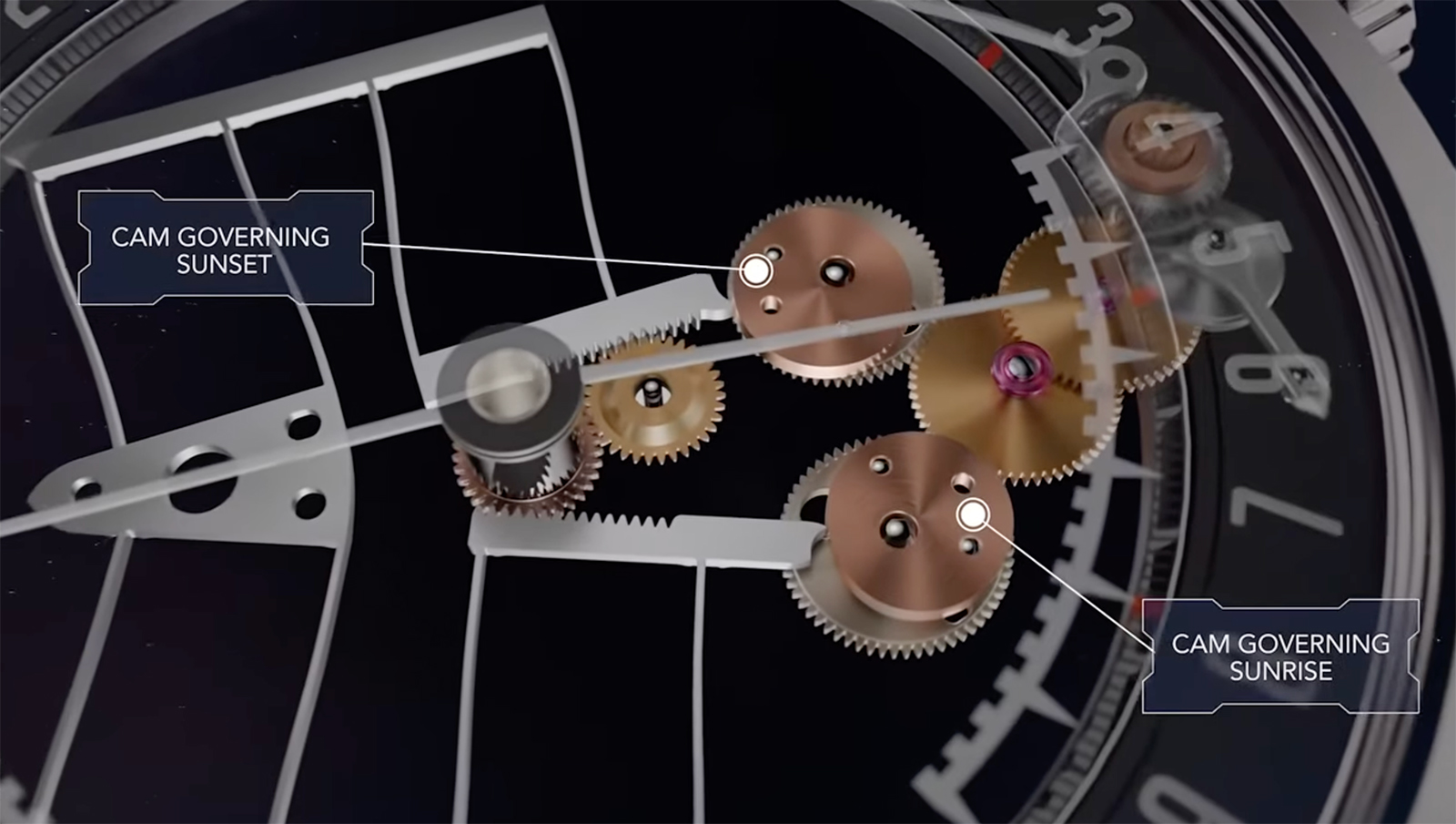 The discrepancy arises as a direct consequence of the construction of the complication, namely the cams. The mechanism that determines sunrise and sunset follow an annual course, each driven by a cam that encode the changing length of the day. When the hour is advanced to account for DST, the 24-hour wheel is displaced accordingly, but the date mechanism is not actuated unless midnight is crossed. The annual cam that governs sunrise and sunset hence does not advance by a full daily increment. Its displacement corresponds only to one hour within a 24-hour cycle, which translates to a fraction of the annual rotation. As the cams are profiled to encode the day-to-day progression of sunrise and sunset over the course of the year, such a sub-daily displacement does not produce a change in the indicated times. The displayed times of sunrise and sunset will hence remain out of step with civil time for a significant portion of the year and can only be accounted for mentally.
