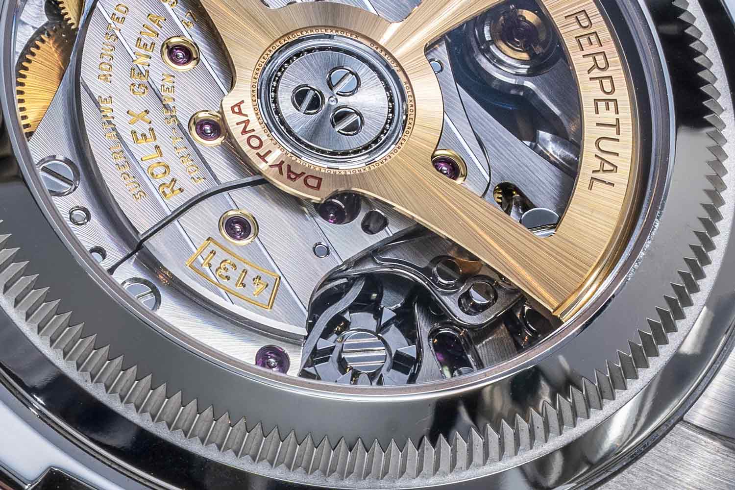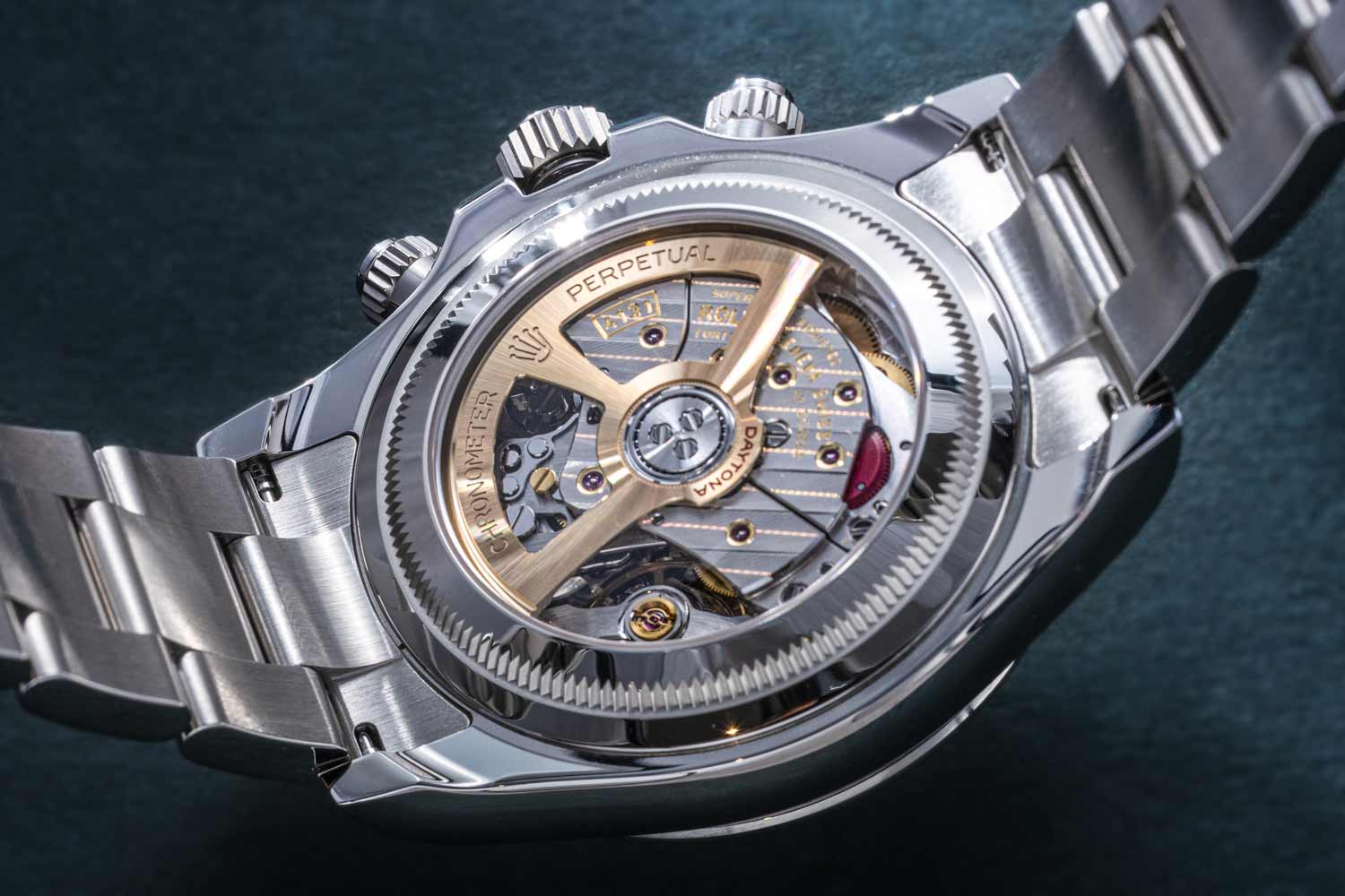 The platinum, however, is used very minimally, only on the frame around the bezel and on the caseback. Minimal, because the caseback is not solid but see through. That is the second surprise, as for the first time on a largely steel Daytona, there is a see-through caseback, revealing the cal. 4131, here fitted with a solid gold, skeletonised rotor on display, something that is usually only reserved for full gold or platinum Daytonas.