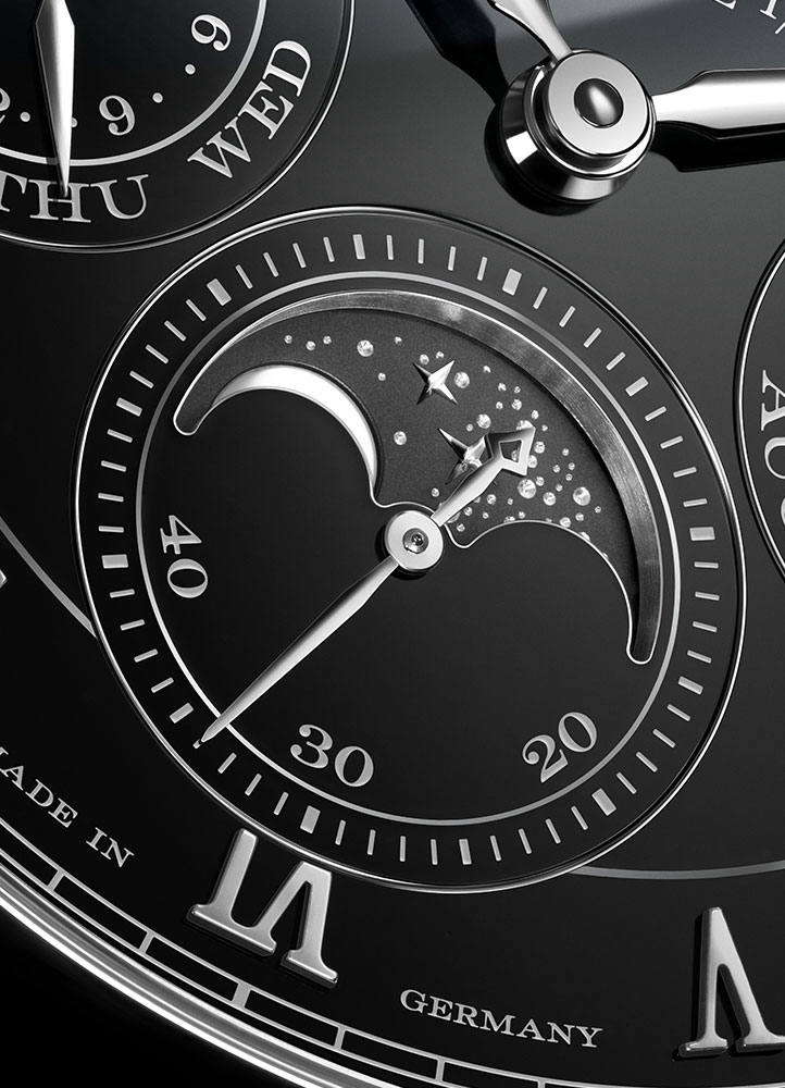 Made of white gold and filled with black enamel, the four-part dial displays the outsize date and accompanying subsidiary dials — day-of-the-week, 24-hour indicator, month and leap year indicators, small seconds and moon phases — against a glossy black surface