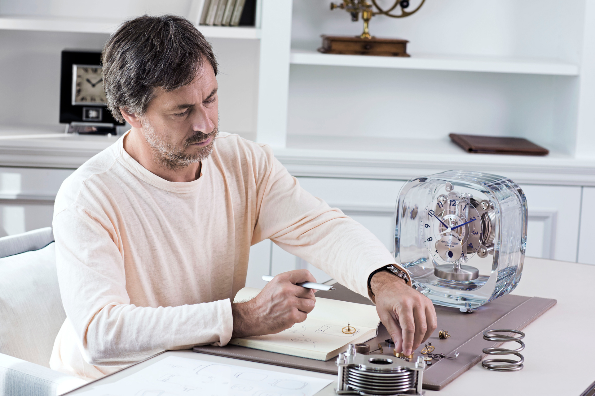 The main idea with the Atmos 568 is that it has an even greater feeling of transparency and lightness, with many elements refined to achieve this effect. Gone are the visible boarders of the transparent disc holding the hour markers, and from the front, the counterweight that forms the winding mechanism is even more integrated into the visible elements such that it seems to disappear into thin air. As with the previous two clocks, the four-point bridge that Newson introduced for symmetry is retained, but the flourish of the attachment points, made obvious when mirrored by the curvature of the crystal case, has been removed, making the bridge appear more elegant, and more purposeful.