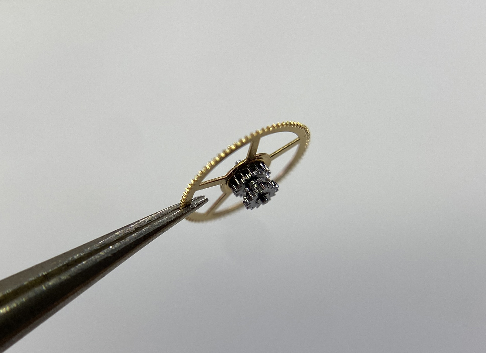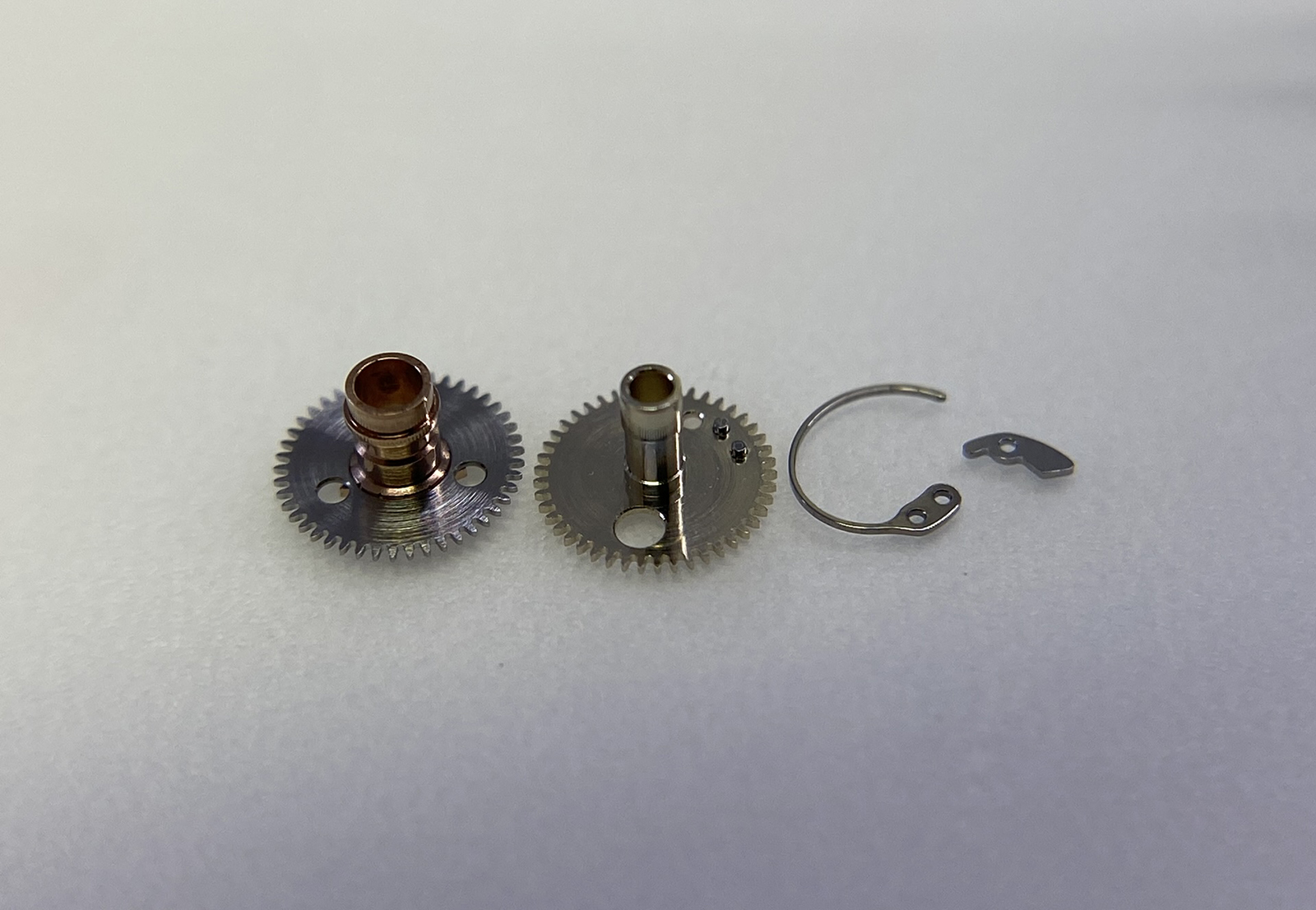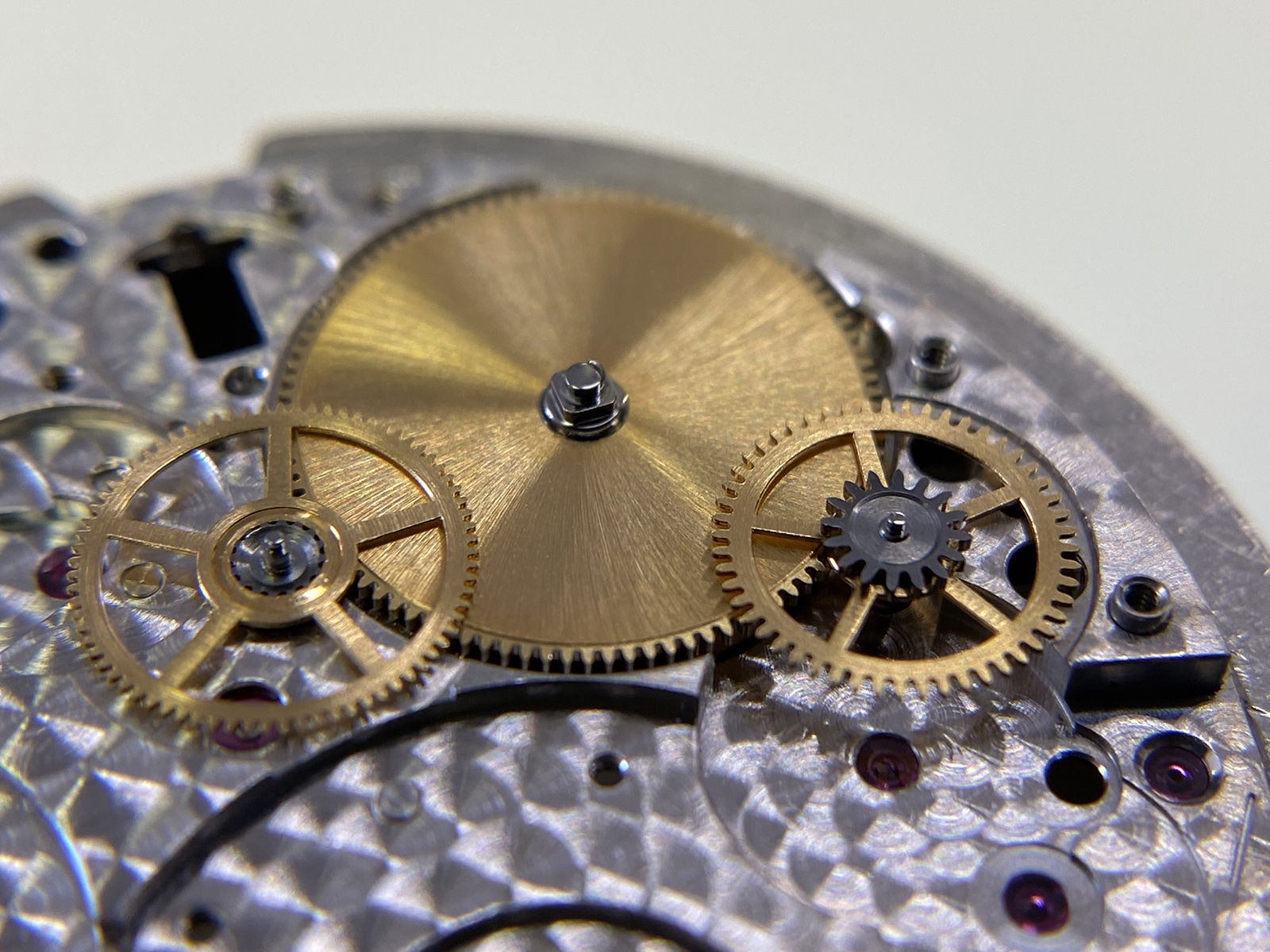 The great wheel (bridge side/movement side) of this caliber also drives the intermediate setting wheels and minute wheel on the dial side, providing the buttery smooth friction that we feel when setting the time. This is thanks to its design, with a total of 4 components that make up this one wheel, it simultaneously interacts with the barrel, third wheel, 2nd intermediate setting wheel, and the minute wheel. Despite the micro-rotor being in the spotlight, the great wheel is the true star of the show!