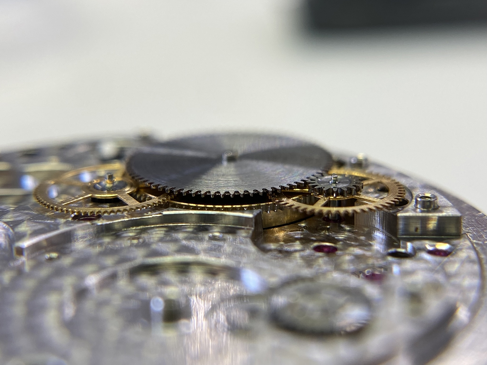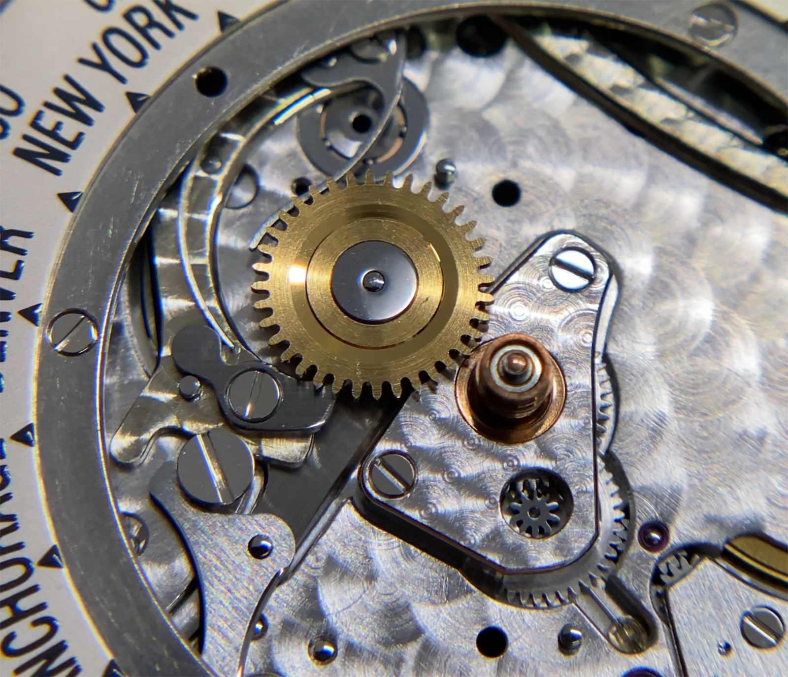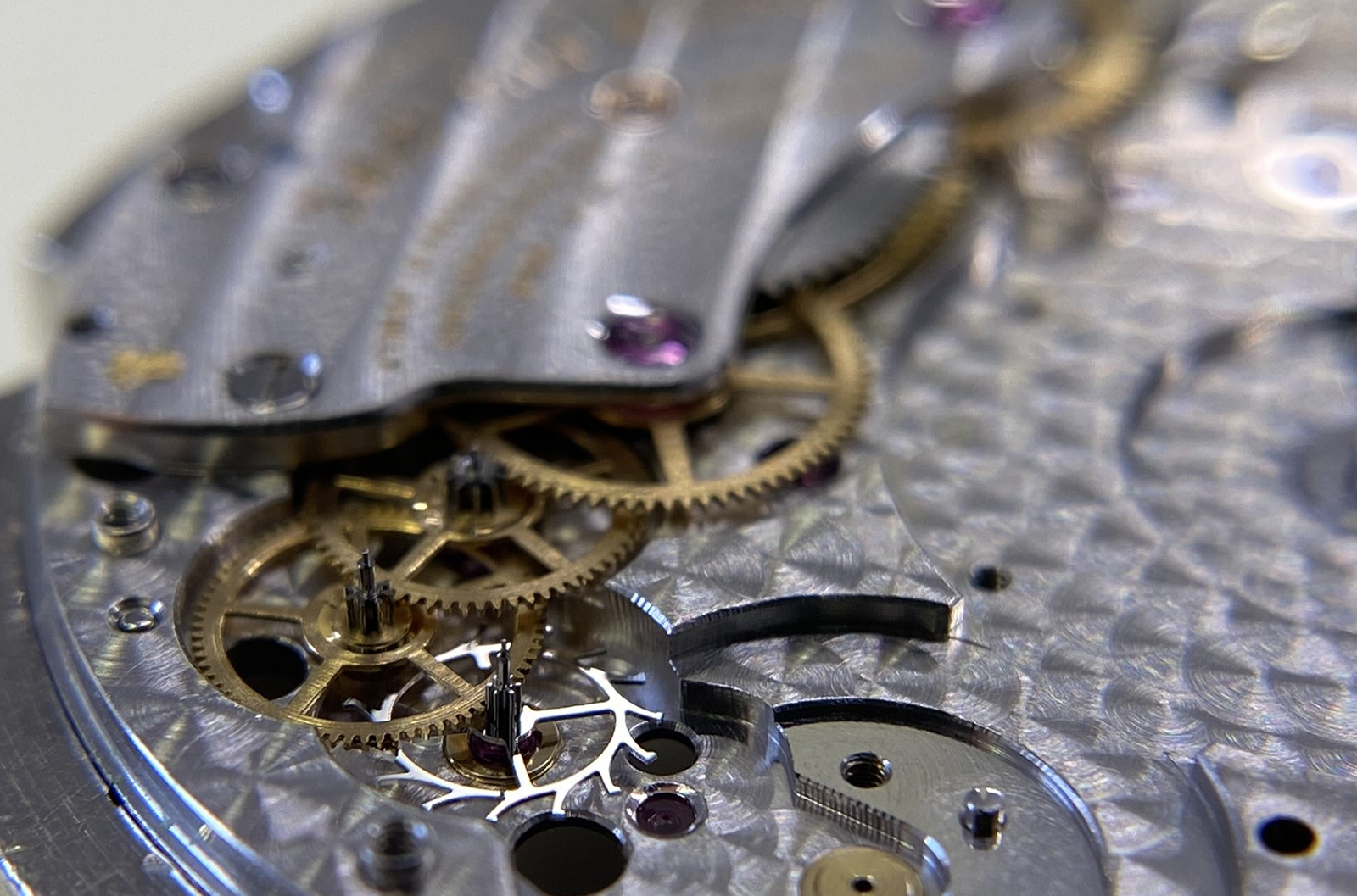 The great wheel (bridge side/movement side) of this caliber also drives the intermediate setting wheels and minute wheel on the dial side, providing the buttery smooth friction that we feel when setting the time. This is thanks to its design, with a total of 4 components that make up this one wheel, it simultaneously interacts with the barrel, third wheel, 2nd intermediate setting wheel, and the minute wheel. Despite the micro-rotor being in the spotlight, the great wheel is the true star of the show!