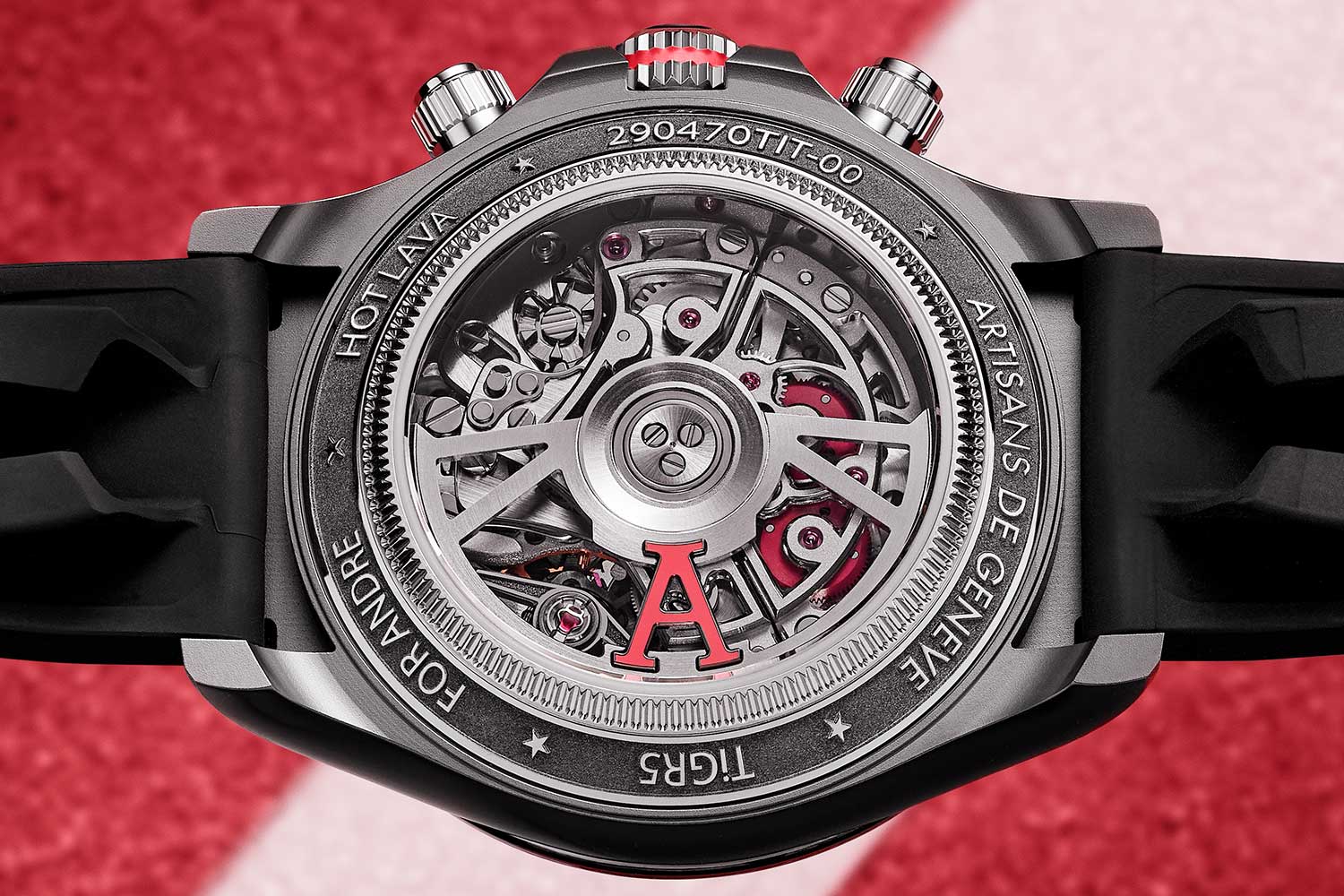 The other side of that legendary Roland-Garros look is, of course, the bright orange pink — realised on the registers of the watch in a molten lava-inspired gradient, providing a striking contrast with the otherwise sober tones of the case. Further custom details can be found on the hands — which have been slimmed down from the original. On top of that, the chronograph seconds hand has been given a pink lacquer tip. The rotor has also been given the Artisans de Genève treatment — custom-made from tungsten, the open-worked design shows off the movement (including a custom balance bridge carved from solid steel and mirror-polished) and features a bold ‘A’, for Andre or Agassi, or both.