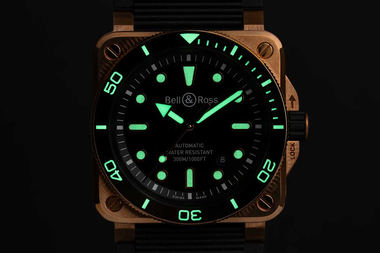 Case 42mm × 42mm × 12.3mm; satin-finished and polished CuSn8 bronze, with stainless steel screw-down caseback; water resistant to 300m