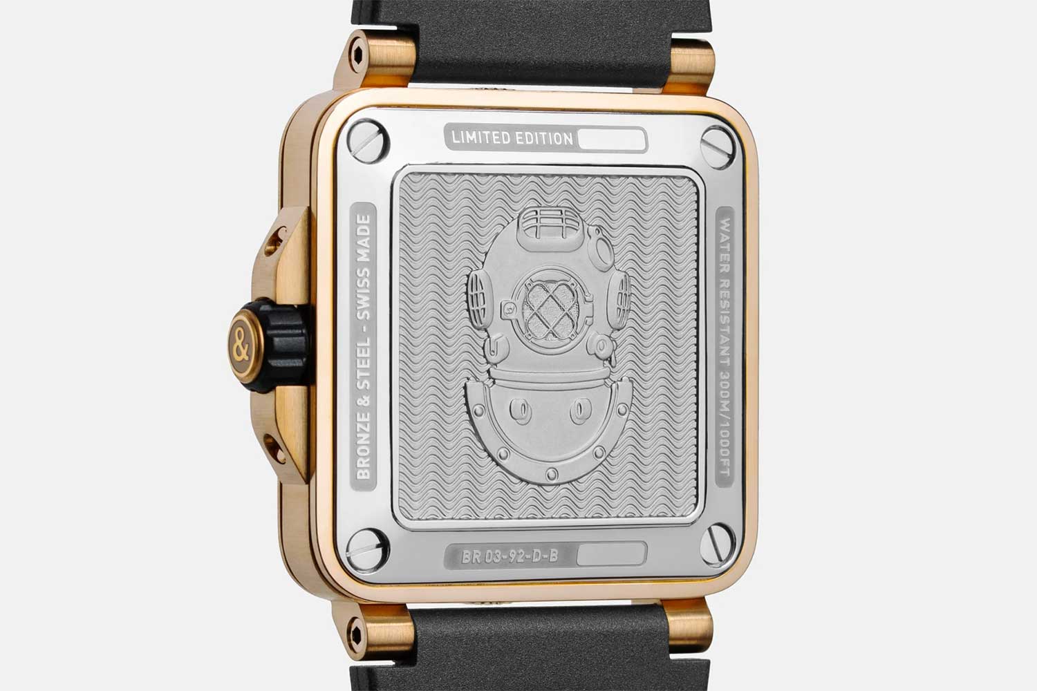 In line with these standards, the case features a telescopic screw-down crown with a rubber insert for easy handling with diving gloves and extra-thick, anti-reflective sapphire crystal. The steel screw-down caseback features an engraving of an antique diving helmet — a subtle reference to the fact that diving helmets were once made of bronze — and ensures water resistance to 300 meters. It is powered by the Caliber BR-CAL.302-1, and beats at 4Hz with a respectable 54-hour power reserve. For double duty on land and at sea, the watch comes with a black rubber and a black synthetic fabric strap.
