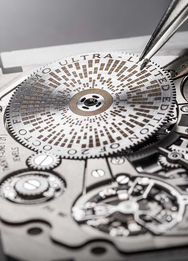 Another aspect of the Octo Finissimo Ultra COSC that represents a radical departure is the elimination of the keyless works entirely. Typically, a watch’s keyless works include components like the winding stem, winding pinion, clutch, and various levers that allow the user to wind the mainspring and set the time through the crown. These parts take up both vertical and horizontal space. Typically, the crown wheel (responsible for winding the mainspring) is situated on the bridge side of the movement, while the motion works (responsible for driving the hands) are located on the dial side. The keyless works enable these two functions to be controlled by the crown, which can be pulled out to different positions to engage either train.