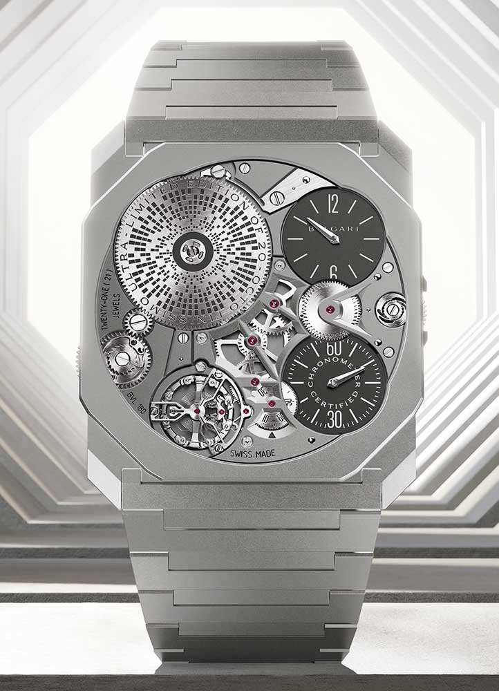 Being a chronometer only adds to the list of features that has set the Ultra apart from previous record holders. This includes being the only one with conventional hands, a seconds indicator, tool-free time-setting and winding, and, perhaps equally impressive, how it fits into the broader, inimitable design language of the Octo Finissimo.