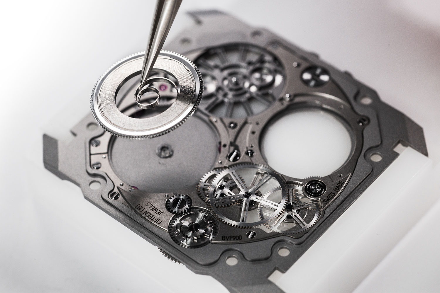 The Ultra Tourbillon’s 40mm titanium case, which is integrated into the baseplate, houses the manually wound BVF 900 calibre that beats at 28,800 vibrations per hour (4 Hz) and offers a 42-hour power reserve — notably 2 hours more than its once-reigning predecessor.