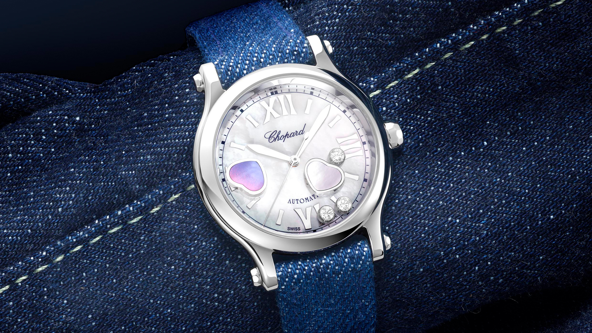 The Happy Sport was created by Caroline Scheufele created in 1993, and combined steel and diamonds on the same watch, which at the time violated an unwritten rule that precious stones belonged only on precious metal. The industry has since caught up. The Happy Hearts extends that spirit into jewellery-dial territory, and the 2026 edition takes it somewhere new with a denim strap.