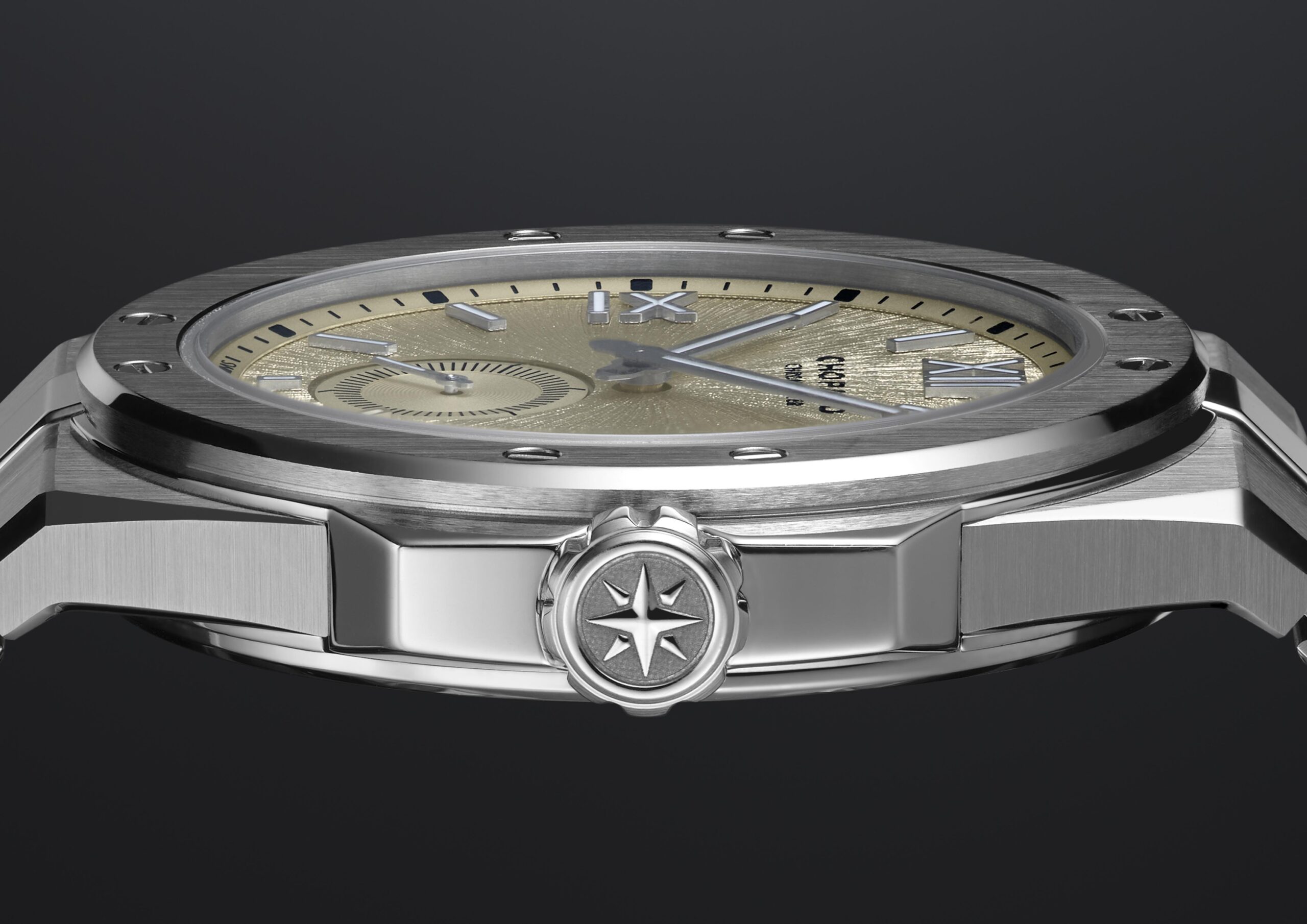 Dial featuring a ‘Mountain Glow’ champagne colour achieved by galvanic treatment, made of brass stamped with a radiating pattern inspired by the iris of an eagle. Applied ethical white gold hour-markers and numerals enhanced with Grade X1 Super-LumiNova®