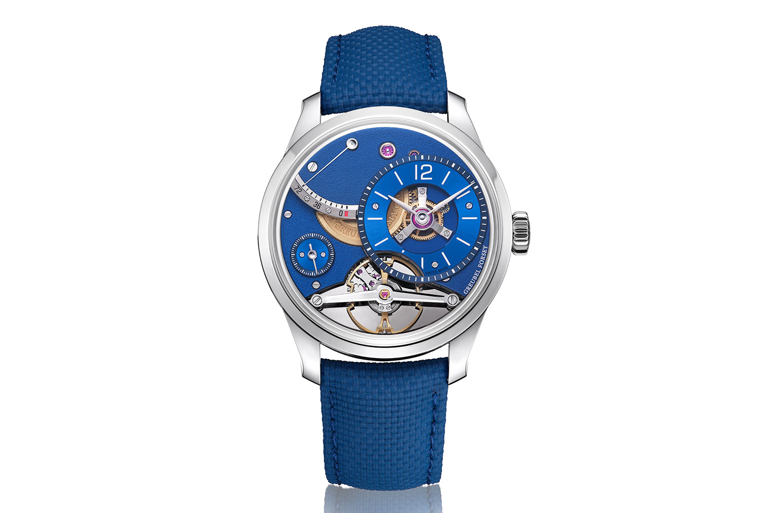 Dial: Multi-level in gold; sunburst blue finish hour-ring; minute-circle with deep blue finish, engraved and white lacquer filled, polished bevel; small seconds, engraved and lacquered with polished bevel; power reserve, engraved and lacquered, hand matt lapped