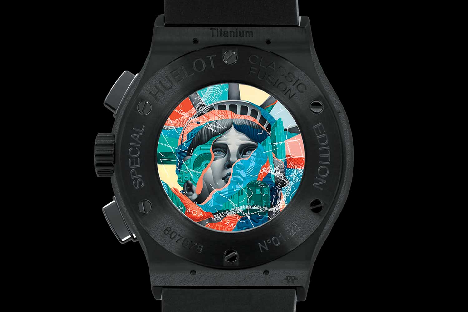 Hublot’s history with Miami explains the ease with which these pieces sit in the environment. The brand first experimented with the city in 2012 when Domingo Zapata covered the Bal Harbour boutique façade during Art Basel. It was a simple idea but it opened the door to further collaborations. Two years later Mr. Brainwash, of Exit Through the Gift Shop fame, wrapped the same storefront with a far denser composition that made the boutique feel more like a temporary installation than a shopfront. In 2016 Tristan Eaton introduced concrete into the conversation with a model that now reads as a clear precursor to this year’s cracked composite cases.