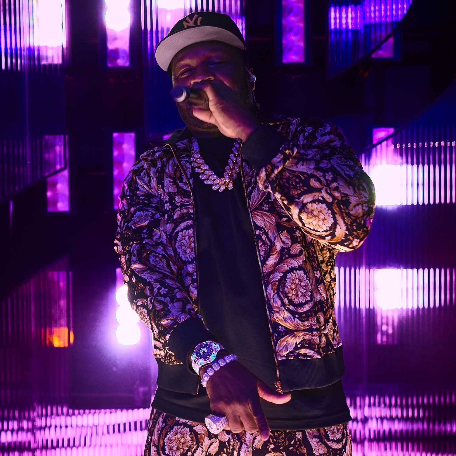 The atmosphere at the launch party reflected that history. Guests entered through a series of rooms in which the sound shifted gently from track to track. Early in the evening a small display of archival Big Bang models marked the collection’s 20th anniversary and placed the new quartet in a wider context. The tone changed when 50 Cent arrived on stage. His performance was brief but well received and he wore a one-of-one Hublot created for the night. The watch carried colors linked to an upcoming film project and included a gold chess piece that nodded to his champagne brand. It sat comfortably within the broader context of the evening without dominating it.