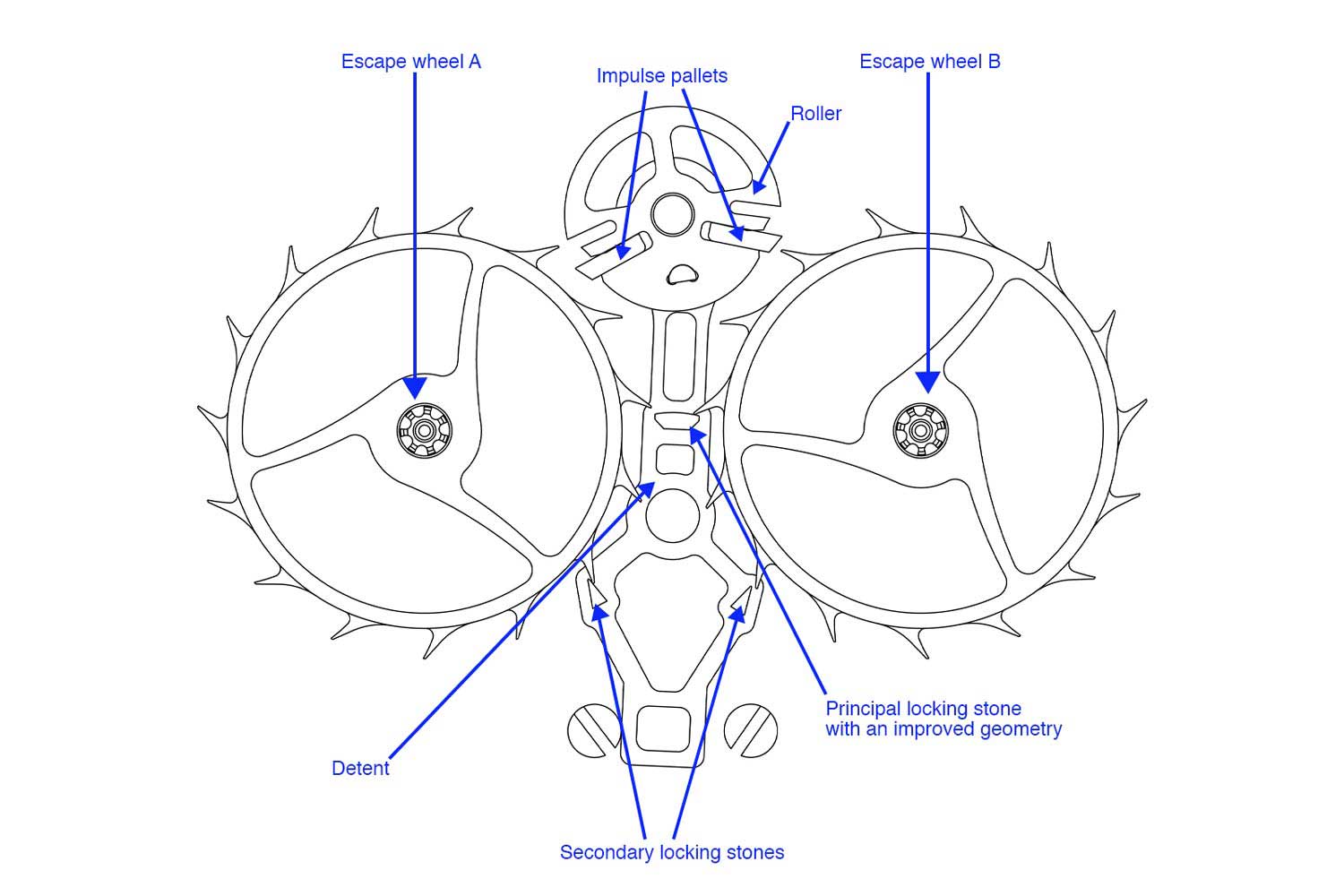 Daniels’ key departure was to eliminate the geared connection between the two escape wheels and instead drive each by its own barrel and gear train, preserving the dual direct principle while freeing it from the constraints of a shared transmission. Lederer took the next step, which was to resolve what had remained a persistent limitation by rendering the system self-starting. He did so by adding an additional impulse surface on either side of the principal locking stone, so that a tooth of the escape wheel that previously rested on the locking stone is guided across a shallow lateral incline, and in passing, it nudges the lever sideways and initiates oscillation.