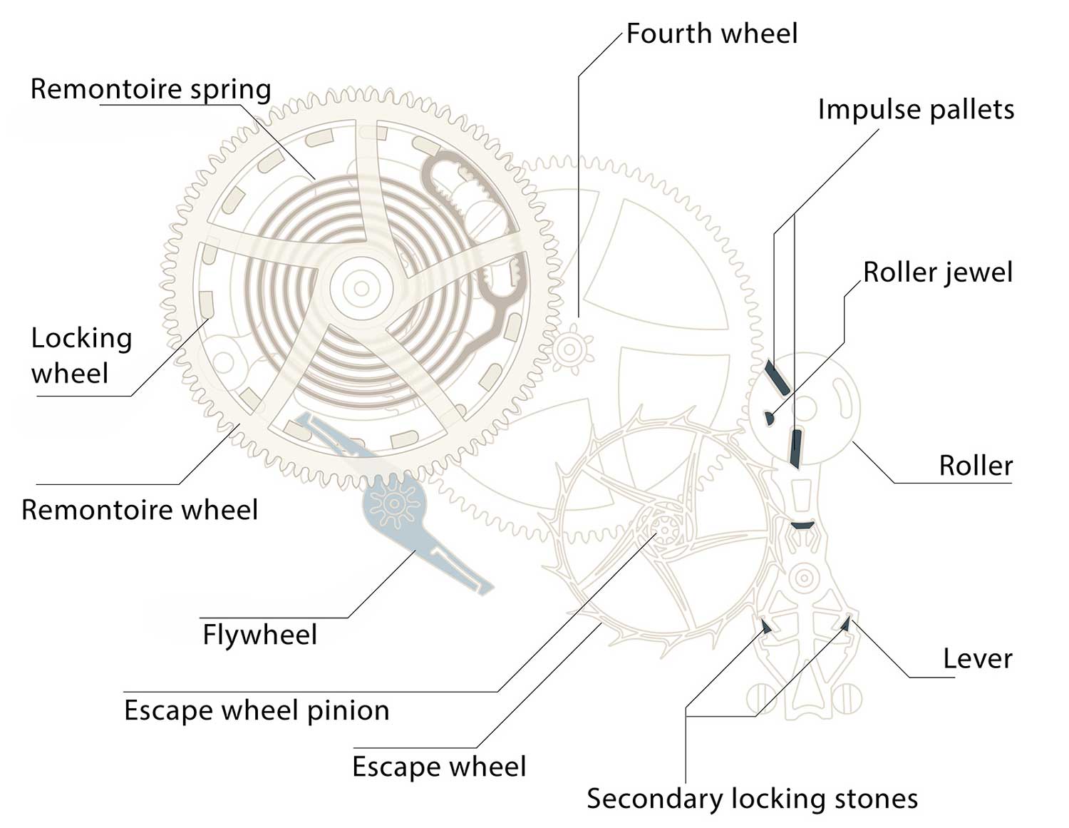 The improved remontoir mechanism in the production version has a simplified setup. The stop wheel is now a flywheel that is located on an additional axle. It is locked and unlocked by a finger on the free end of the fork