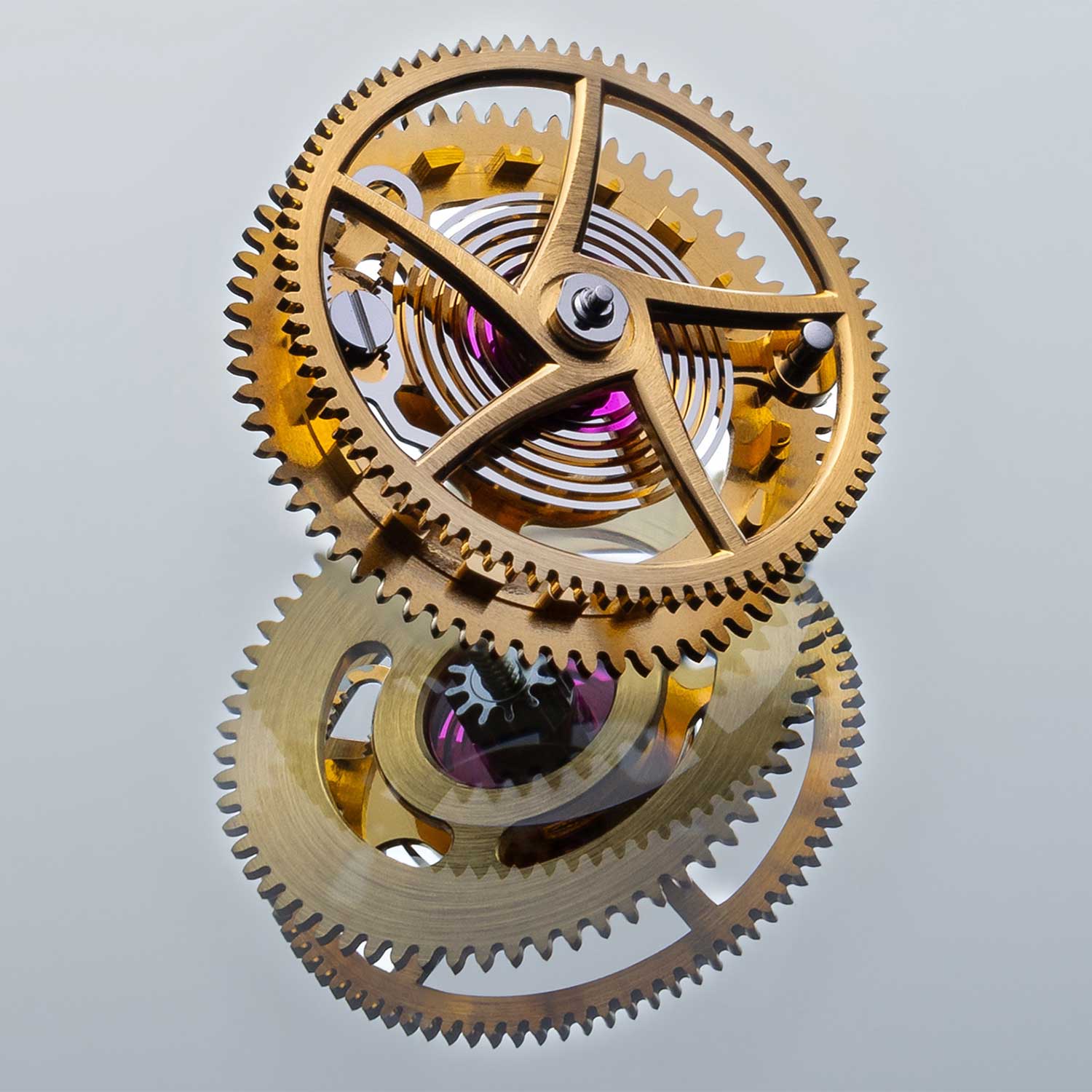Yeah, I made a half-flying tourbillon. It’s a tourbillon without a cage, because the cage is the big handicap. It’s like trying to pull a very heavy trailer with a small car. It all comes down to accelerating mass. In a tourbillon, at every tick the cage has to move and then be stopped, and for the next tack it has to move and be stopped again. So tick-tack, tick-tack, always move, stop, move, stop. And all of that has to be handled by the pallet. You have to stop the entire mass with this very small pallet, which is a severe load.