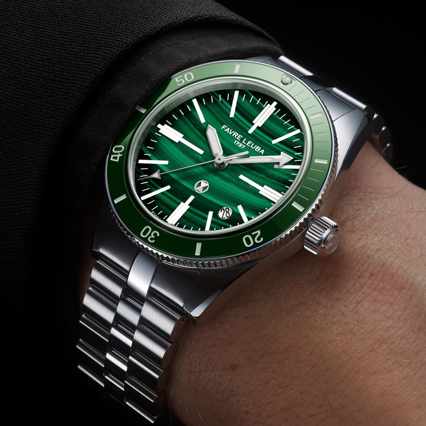 - The Favre Leuba Renaissance with a malachite dial, distinguished by its rich green tones and natural stone striations