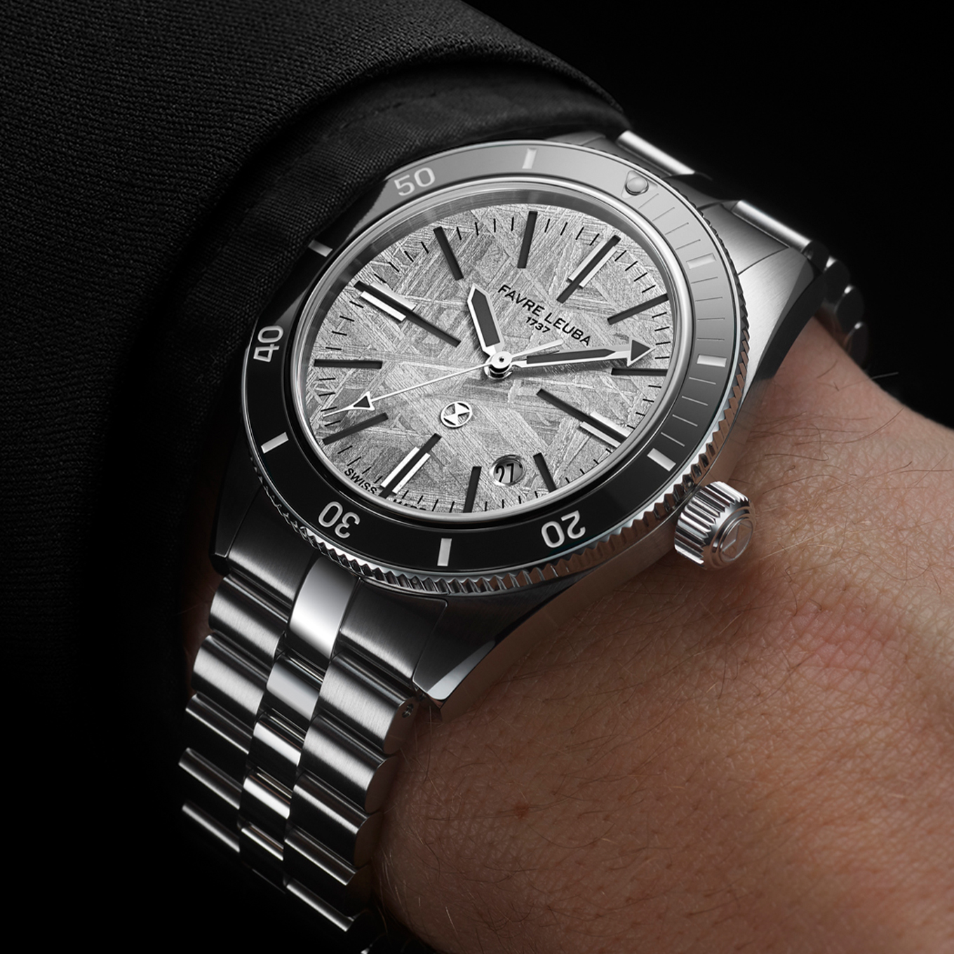 - The Favre Leuba Renaissance with a meteorite dial, showcasing a naturally patterned surface unique to each piece