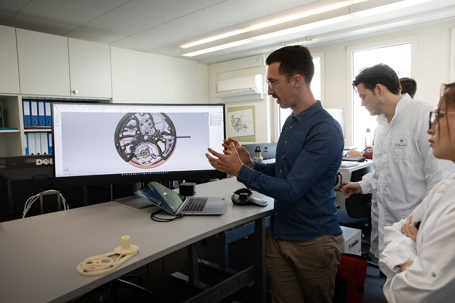 The tour began in the construction room, where movements take shape in CAD and the geometry, tolerances, and spatial relationships of every component are determined. Parts are laid out in three dimensions, which allow clearances, engagement and kinematics to be resolved on screen, while ensuring that what is drawn can ultimately be manufactured, assembled and adjusted at the bench.