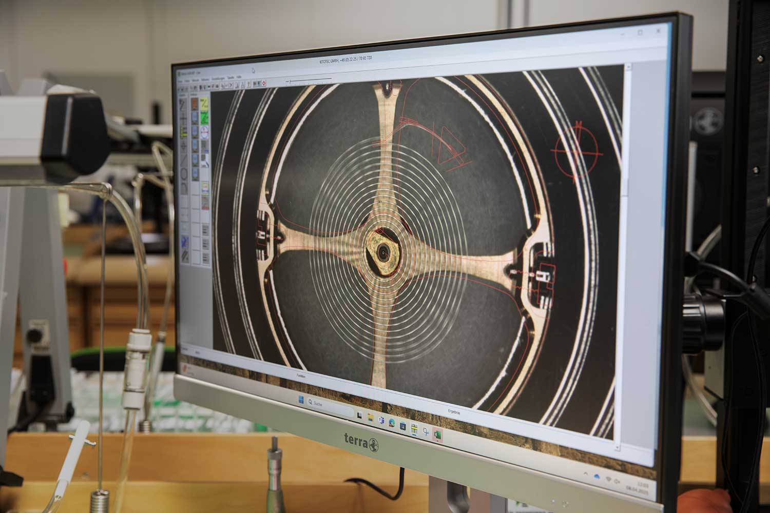 Before any terminal shaping takes place, the hairspring undergoes flat truing and calibration. Its vertical and horizontal behaviour is examined, the motion is observed and the spring is adjusted until it lies perfectly flat. This step relies almost entirely on visual judgement and experience. The hairspring is then tested, a stage he noted had historically revealed issues, which explains why so many preparatory steps now precede it. As a result, rejection rates are very low, at around two percent.