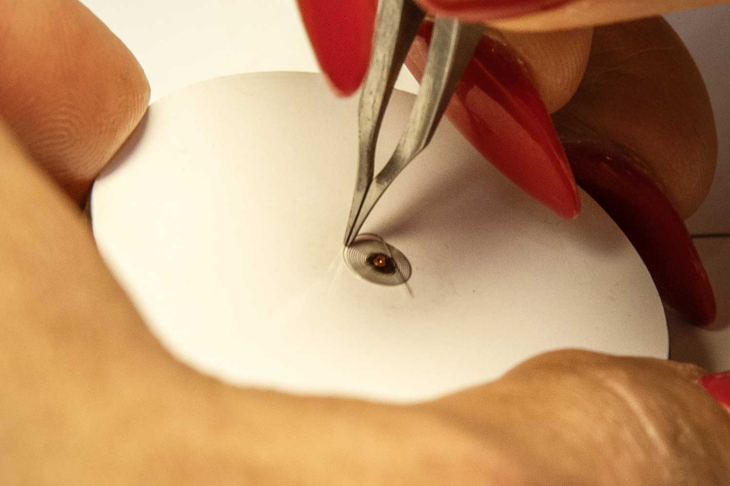 Once the hairspring is validated, the terminal curve is then formed by hand, either as a flat terminal or as a Breguet overcoil. This is the most delicate stage, as it determines how concentrically the spring breathes and therefore its isochronism. Forming a single overcoil can take around an hour, with minute corrections made to lift, curvature, and orientation.