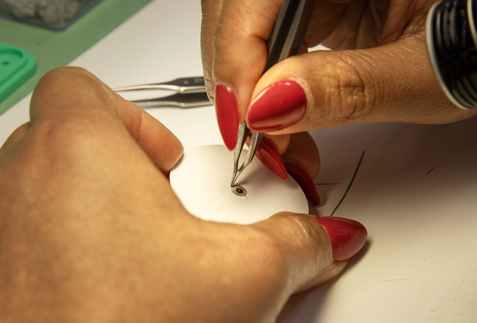 Attaching the hairspring to its collet, a small metal hub that fixes the inner end of the hairspring to the balance staff