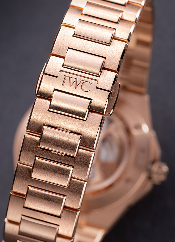 For this watch, IWC chose 18K 5N gold, an alloy known for its warm color, and finished the surface with hand polishing and brushing. Its measurements are slightly above the Royal Oak Jumbo, but well below that of Ref. 1650 — 40mm in diameter and 9.5mm in height, and a lug-to-lug distance of 40.7mm. The water resistance rating of 100m also exceeds that of other luxury integrated-bracelet sports watches.