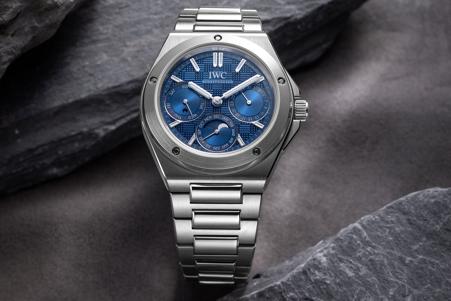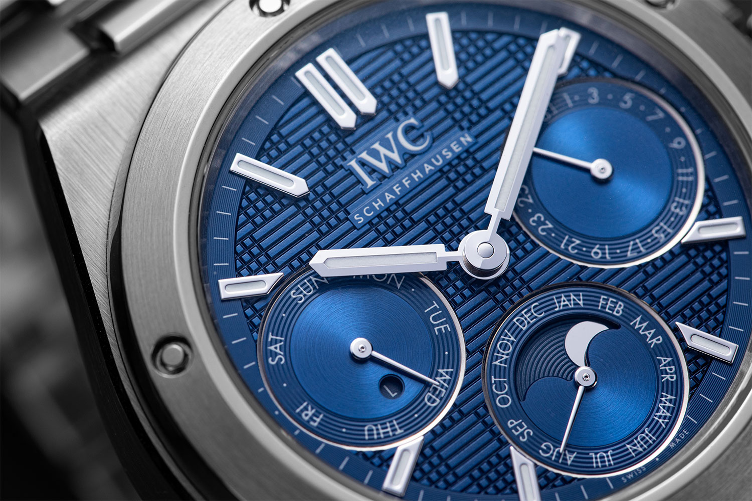 The three perpetual calendar subdials have been integrated into the Ingenieur dial: date at 3 o’clock, day of the week at 9 o’clock, while the one at 6 o’clock combines the month with the perpetual moon phase. Image: Revolution ©
