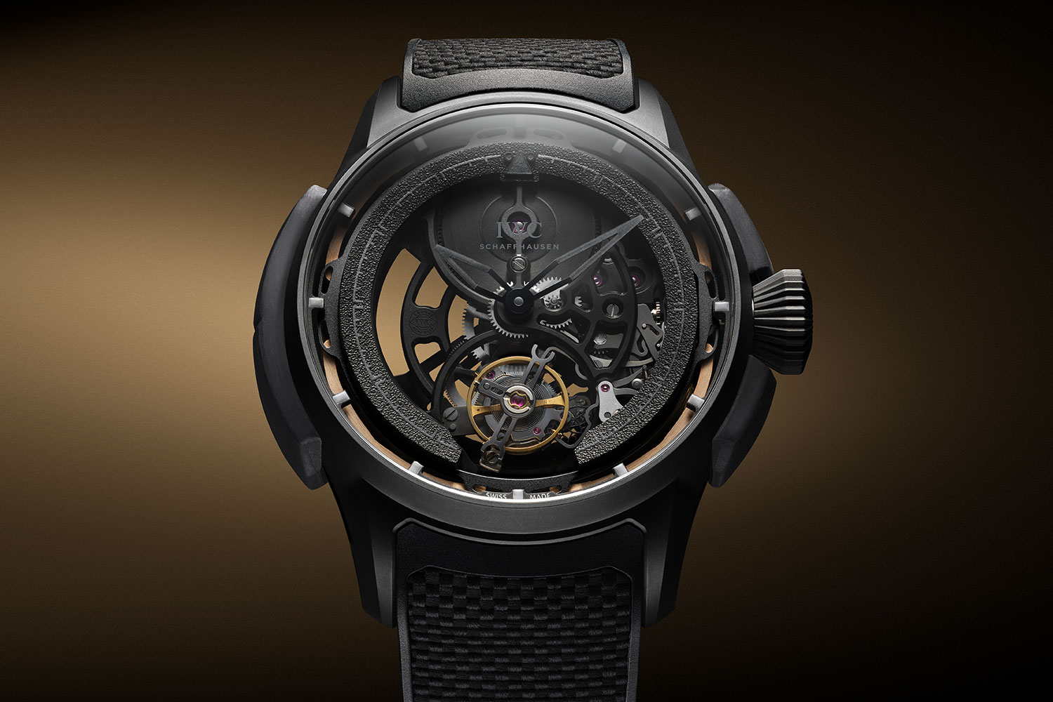This new system features a completely redesigned cantilever spring made from bulk metallic glass (BMG), a material with an amorphous structure giving it extraordinary elasticity. The spring cradles the skeletonized IWC-manufactured 82915 calibre with flying minute tourbillon, suspending it inside the Ceratanium case.