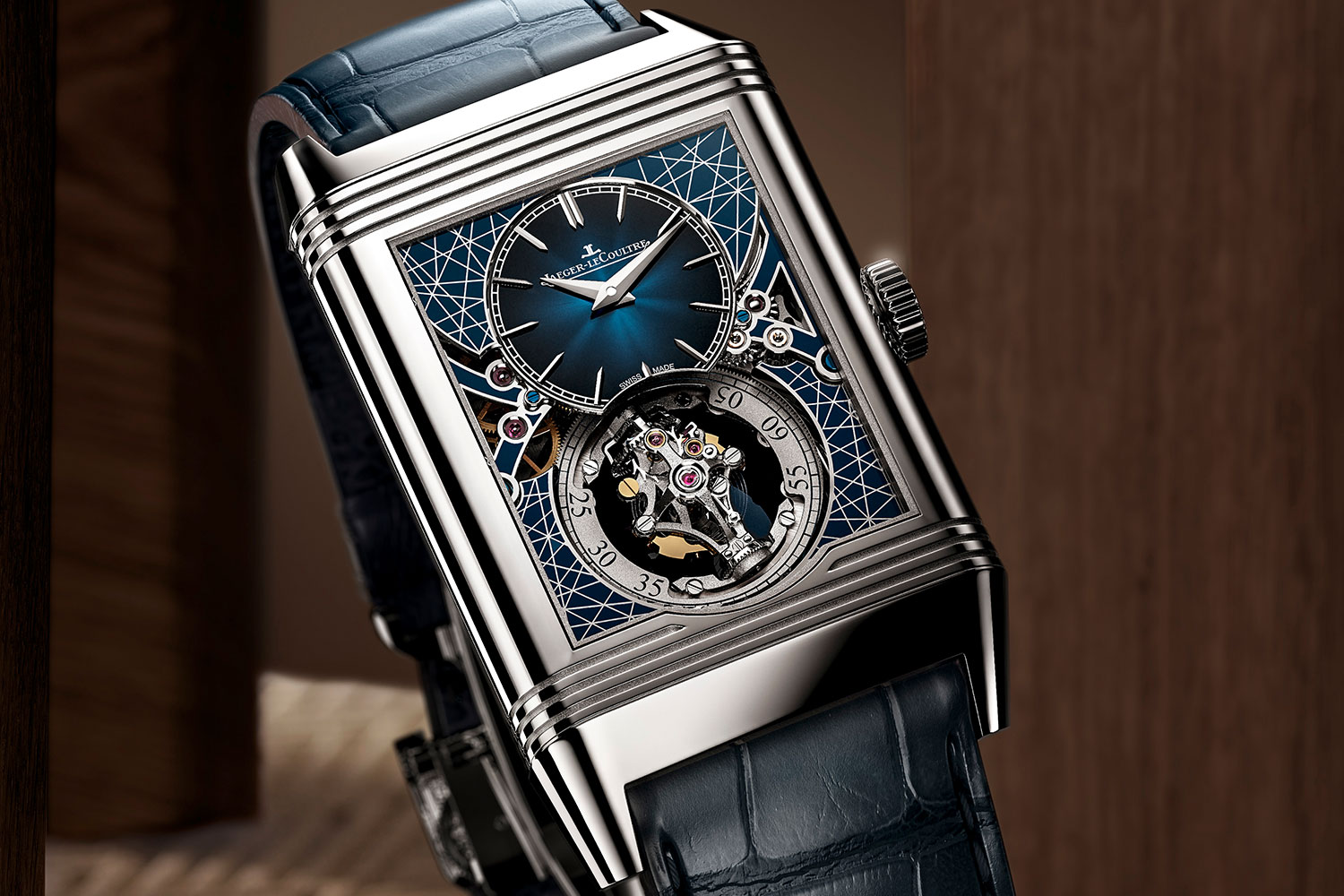 At the heart of the watch is the Calibre 179, featuring Jaeger-LeCoultre’s signature 123-component multi-axis Gyrotourbillon, with an inner cage rotating every 16 seconds and a peripheral carriage completing a revolution each minute. Thanks to the mirror-polished blue lacquer disc beneath, the tourbillon appears to float between the watch’s two faces.