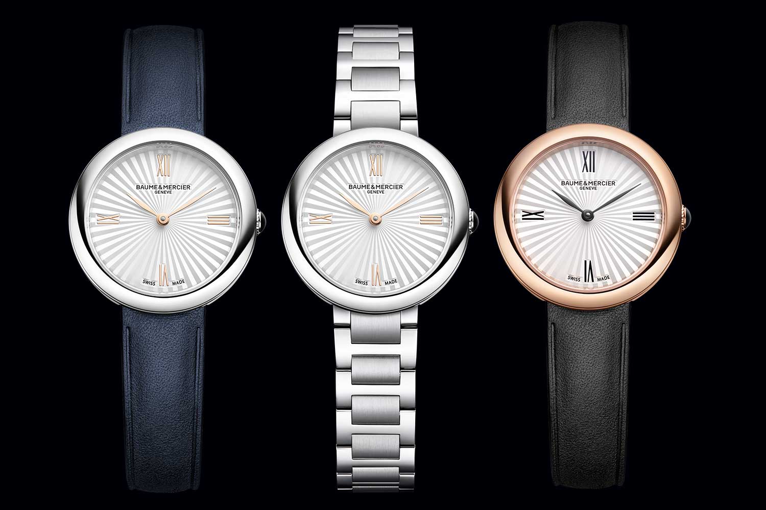 Reference M0A10847 pairs its polished steel case with 4N gold-plated Roman numerals and leaf hands, set against a midnight blue calfskin strap for a softer, more classical expression. Ref. M0A10848 retains the same dial details but takes on a more sculptural character through an integrated polished and satin-finished stainless steel bracelet with three rows of H-shaped links and a triple folding clasp. Ref. M0A10849, by contrast, introduces greater visual contrast through a polished 4N PVD-treated steel case, black Roman numeral transfers, ruthenium leaf hands and a black calfskin strap with a matching 4N PVD-treated steel pin buckle. Across the three, the idea is one of consistency in silhouette, with each model offering a distinct variation in mood, finish and presence.
