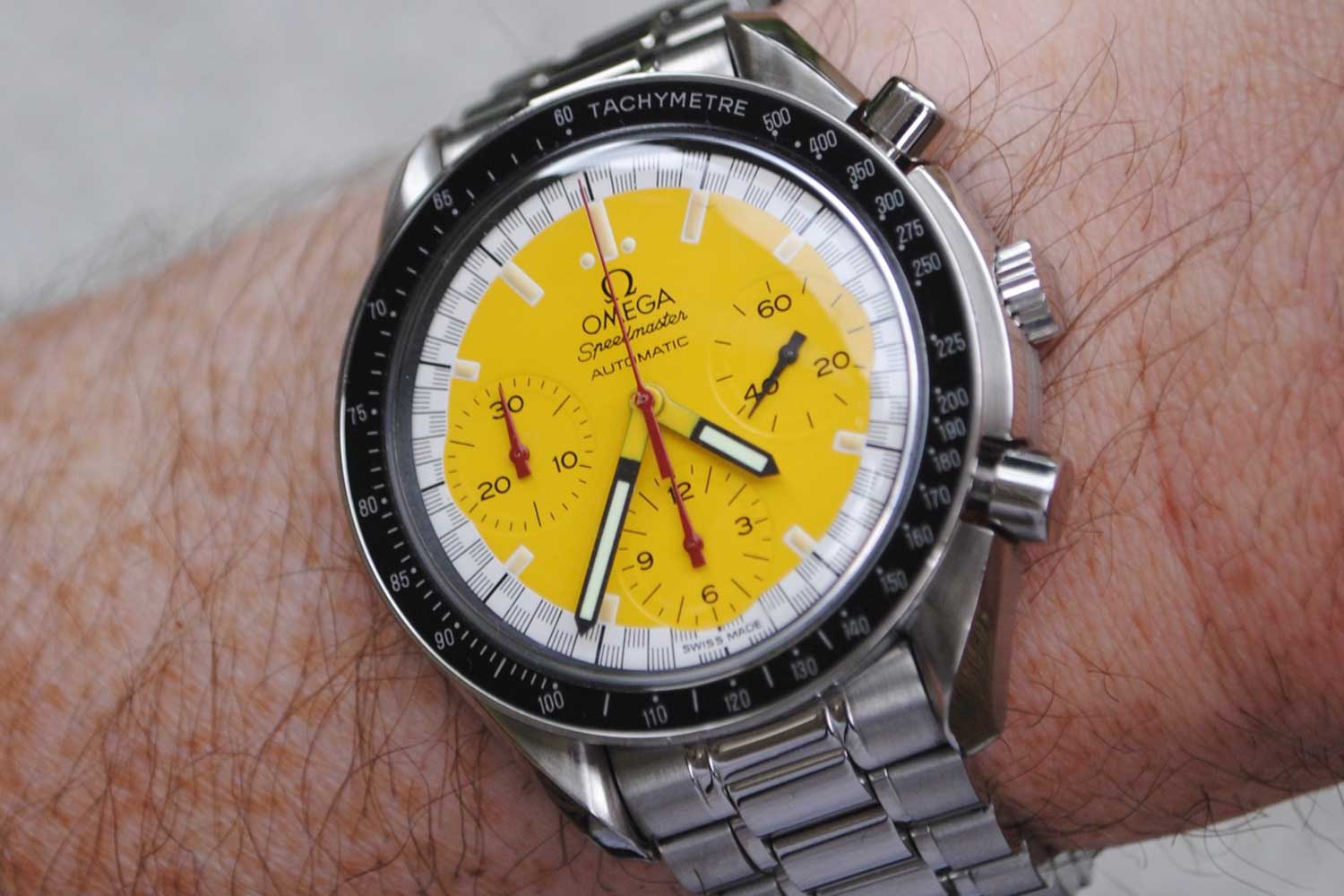 One of the most interesting (and certainly unique) Speedmaster Reduced‘s belongs to UK-based engraver Johnny Dowell, better known as King Nerd. From the dial side it looks like a regular Reduced, with a bright and happy yellow dial, but turn it over and take it off and it becomes something very special indeed. The caseback features Snoopy, in an F1 car bearing Michael Schumacher’s number seven, racing through a giant Omega logo. The details don’t stop there, as the folding clasp also features Snoopy-as-Schumacher, holding aloft the Formula 1 Championship trophy.
