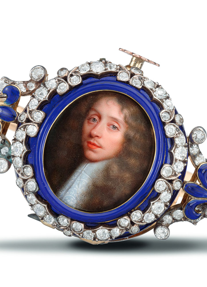- A small gold pocket watch (circa 1875) that incorporates enamel and diamonds