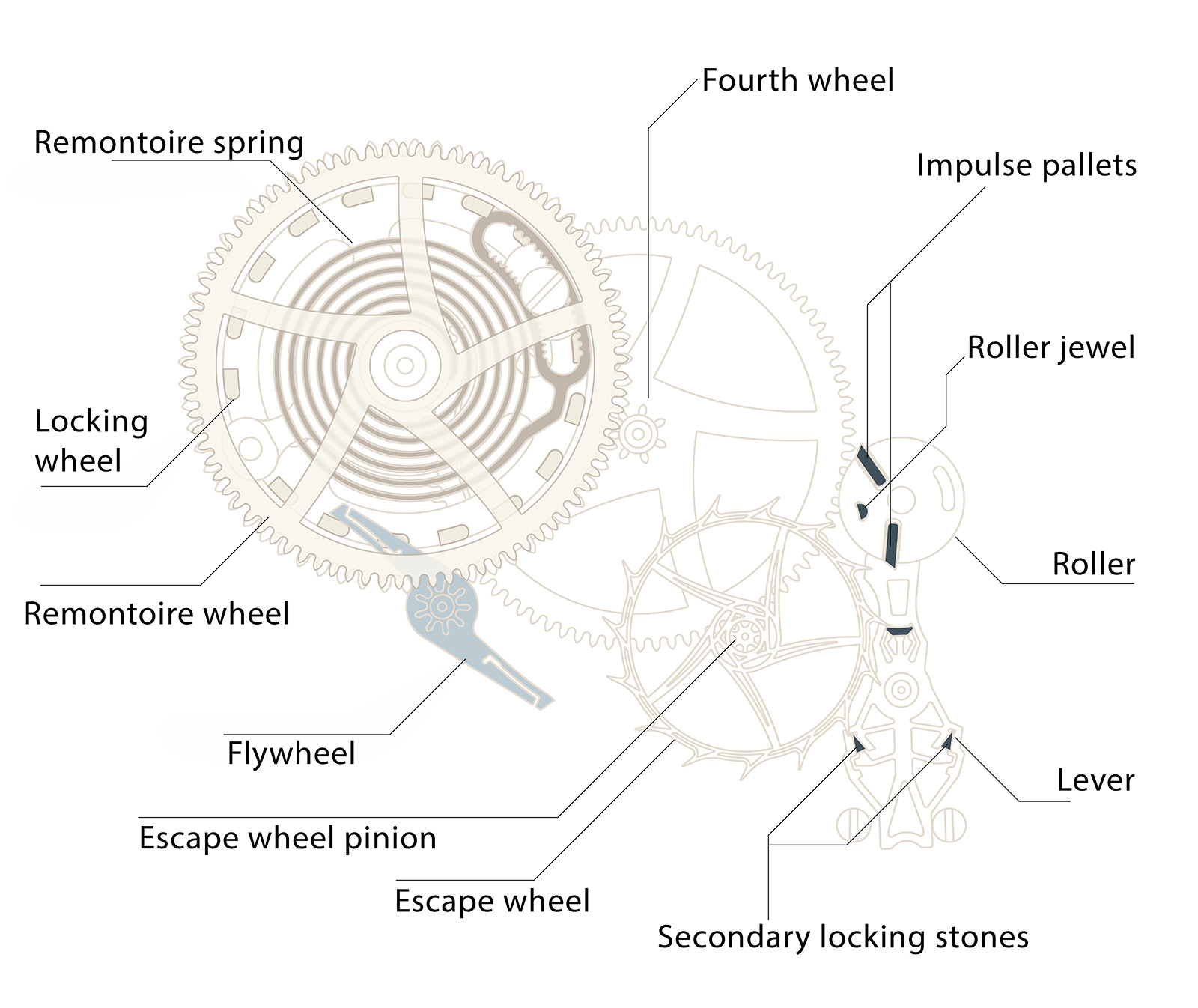 The release mechanism is positioned directly on the same axis as the remontoir spring, allowing the remontoir to be triggered precisely at the point where energy is introduced