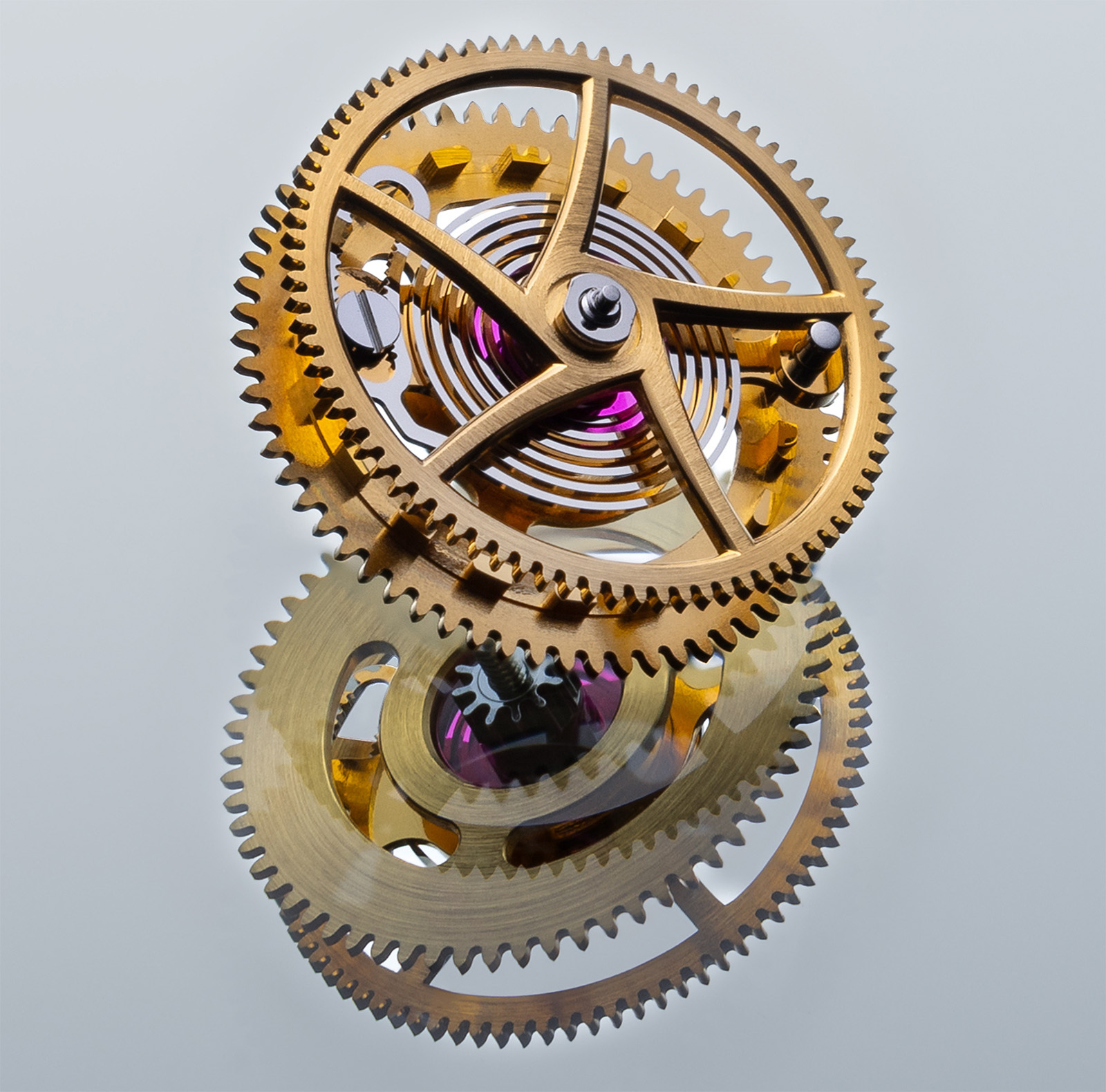 Lederer CIC 39 “Eddy Jaquet & Yann von Kaenel” for Revolution. Both barrels are wound via a crown wheel with integrated triple winding clicks. As the escape wheels must be driven in opposite directions, an intermediate wheel is added between the crown wheel and the second barrel ratchet to reverse the direction of rotation (©Revolution)