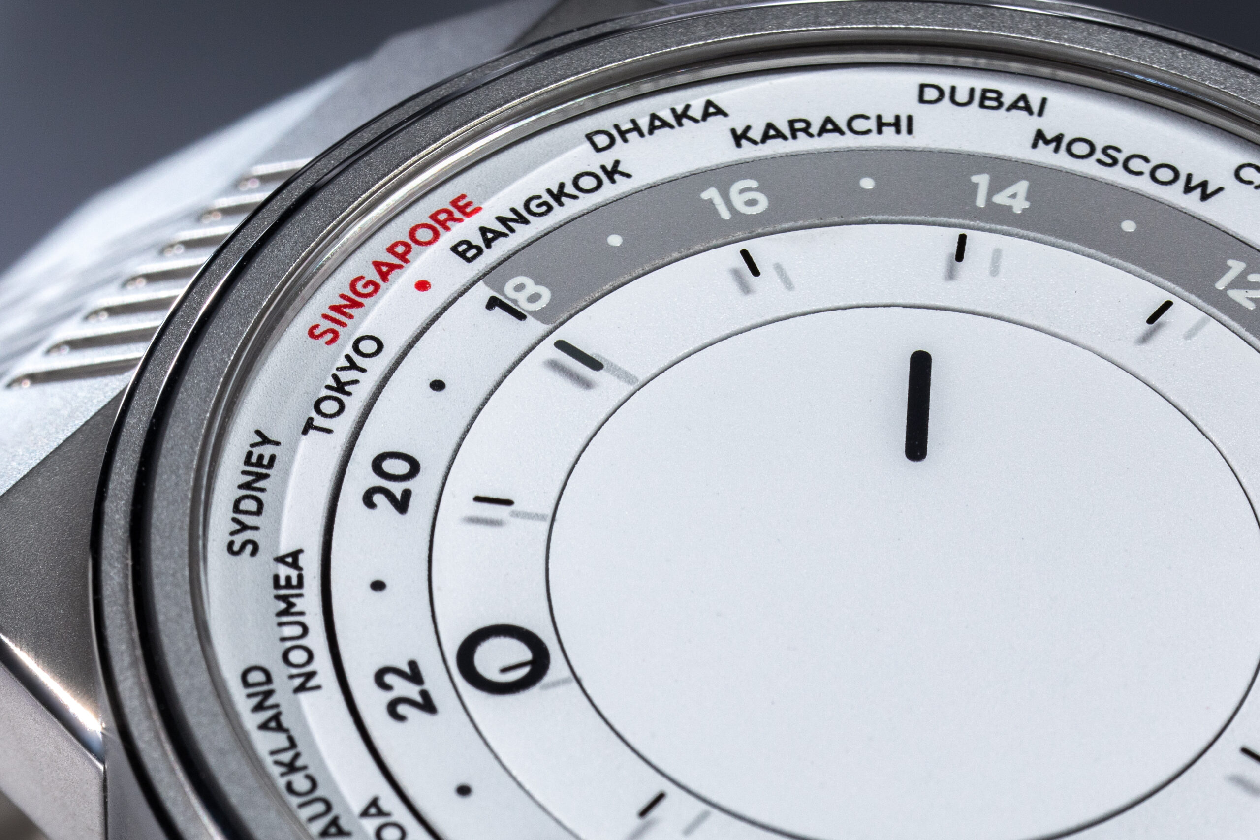 The third disk displays the 24-hour scale, half of which are marked out in white numerals for day and black ones for night. They are fringed by the last disk displaying names of 24 cities around the world.