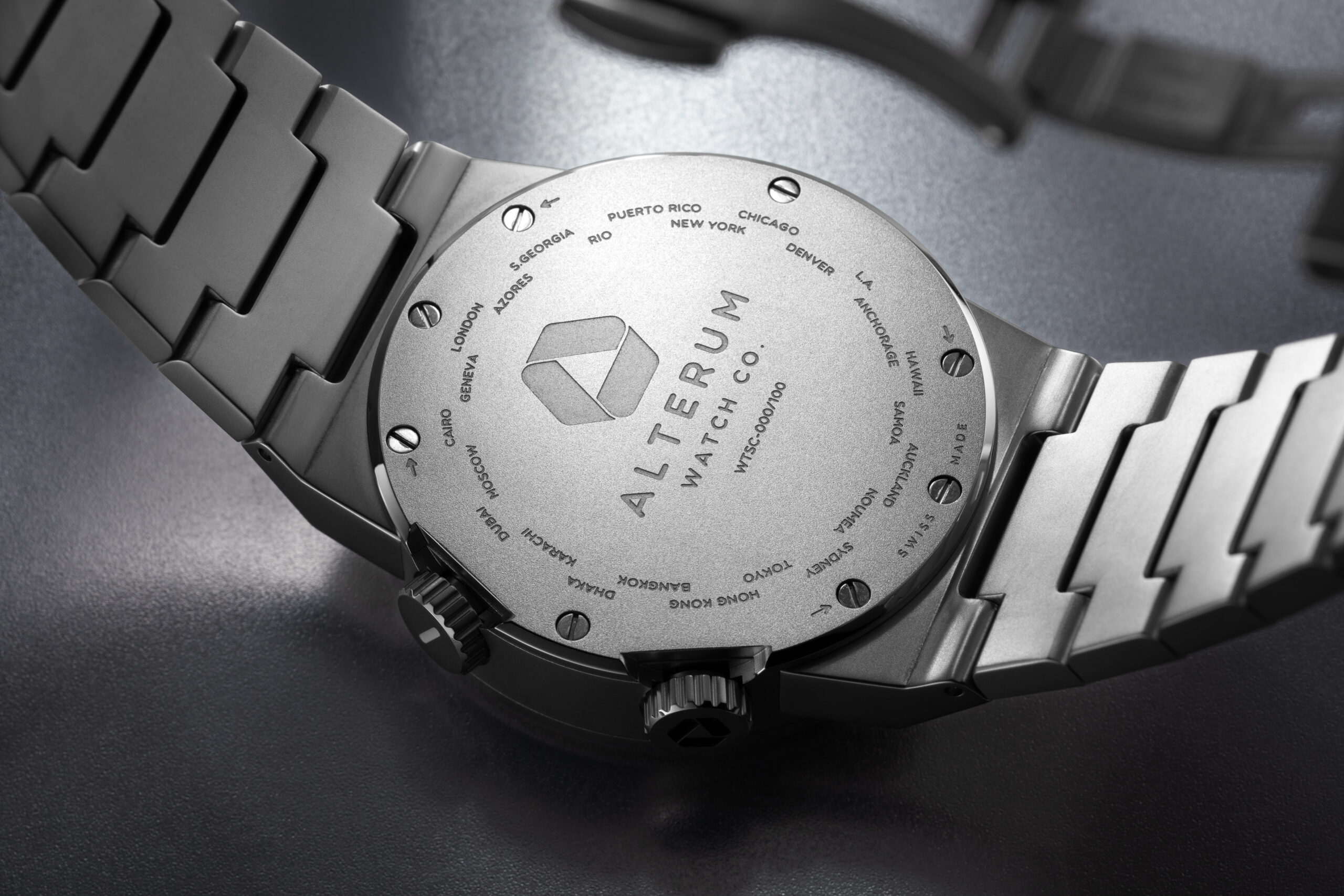 Two crowns sit at 2 and 4 o’clock, slightly recessed into the case and bearing a white line and the Alterum logo respectively. The former lets you set the bidirectional city disk while the latter winds the watch and sets the time.