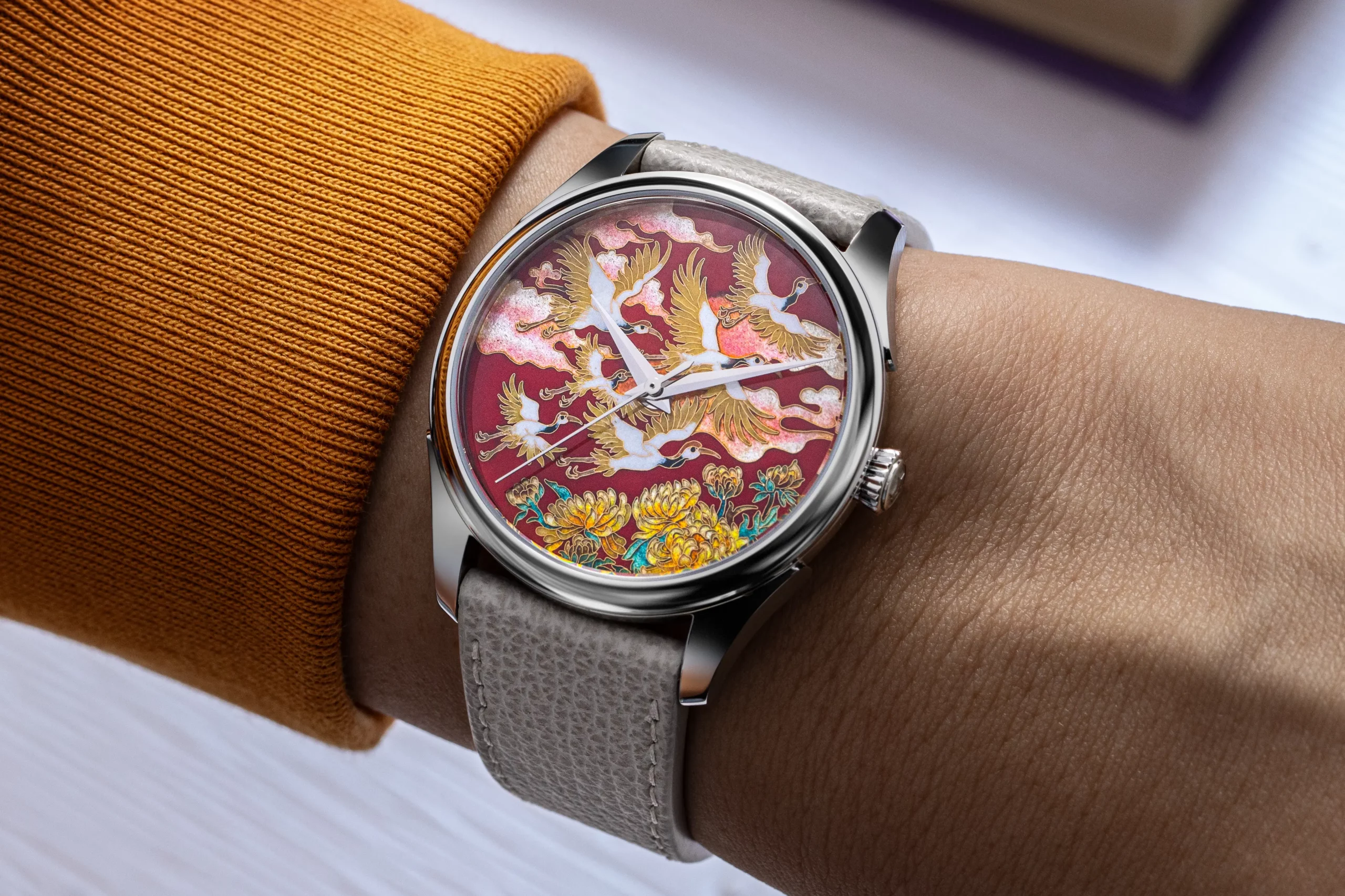 The term cloisonné — derived from the French word cloison, meaning “partition” — refers to the wires used to outline the decorative motifs before filling them with enamel. The process is laborious and demands exceptional craftsmanship, with very few artisans capable of executing it at a high level. As a result, production was extremely limited. Across all watch brands, only a few hundred cloisonné enamel wristwatches were ever made, making them prized rarities in the world of fine watchmaking.